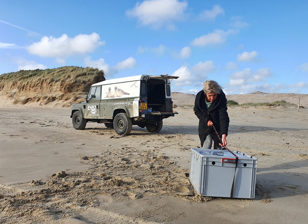 Op bovenstaande foto is te zien hoe zeehondenwachter Marjolein de kist afsluit waarin we net een verzwakt zeehondje hadden neergelegd.