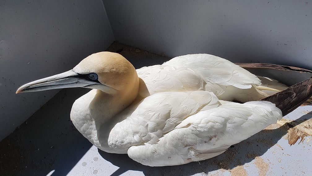 Het bleek een volwassen Jan-van-Gent, een zeevogel met een spanwijdte van 2 meter die normaal vluchtgedrag zou moeten vertonen maar nu dus vrijwel zeker in problemen zat.