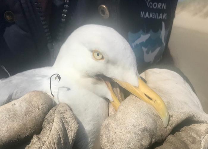 Nadat we de meeuw hadden gevangen bleek het dier nog een vishaak in de bek te hebben en flinke snijwonden aan de vleugel en de rechter poot.