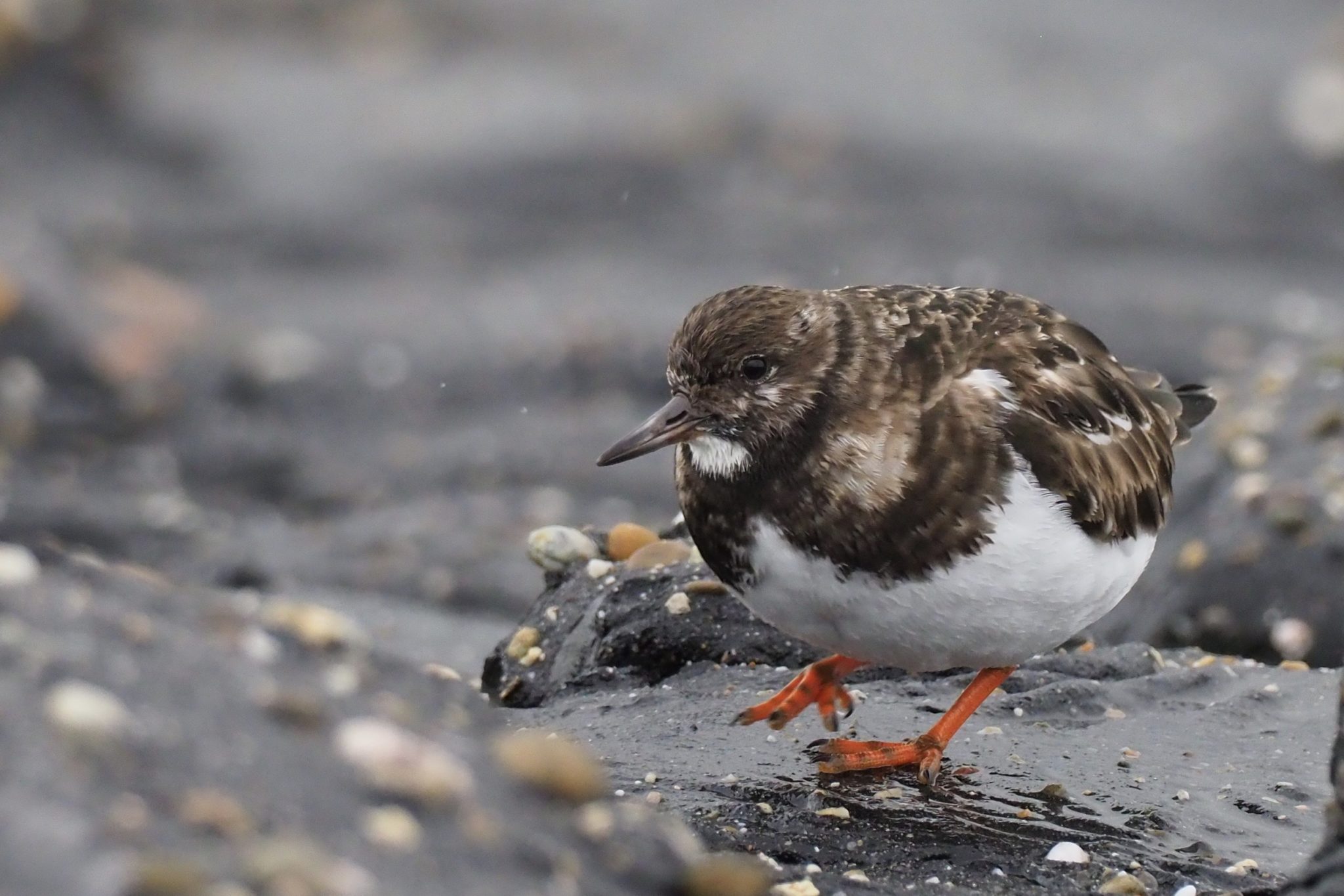 Vrijwel onopgemerkt dribbelen de steenlopertjes over de met zwart asfalt overgoten basaltblokken aan de rand van de vloedlijn op de Brouwersdam. Goed beschermd door hun schutkleur vallen ze de argeloze voorbijganger nauwelijks op. Het bruin-grijze verenkleed met de witte buik en de kleine afmeting zorgen ervoor dat ze vrijwel volledig opgaan in hun omgeving. Dit exemplaar is vermoedelijk nog een jonkie, gezien de lichtbruine randen aan de veren. De adulten zijn donkerder en missen die randjes. Maar wat is de functie van die fel oranje kleur van de poten op deze zwarte ondergrond?? Een beetje Darwin en een paar generaties verder en ze hebben zwarte poten. De naam voor de nieuwe ondersoort hebben we al: asfaltlopertje.