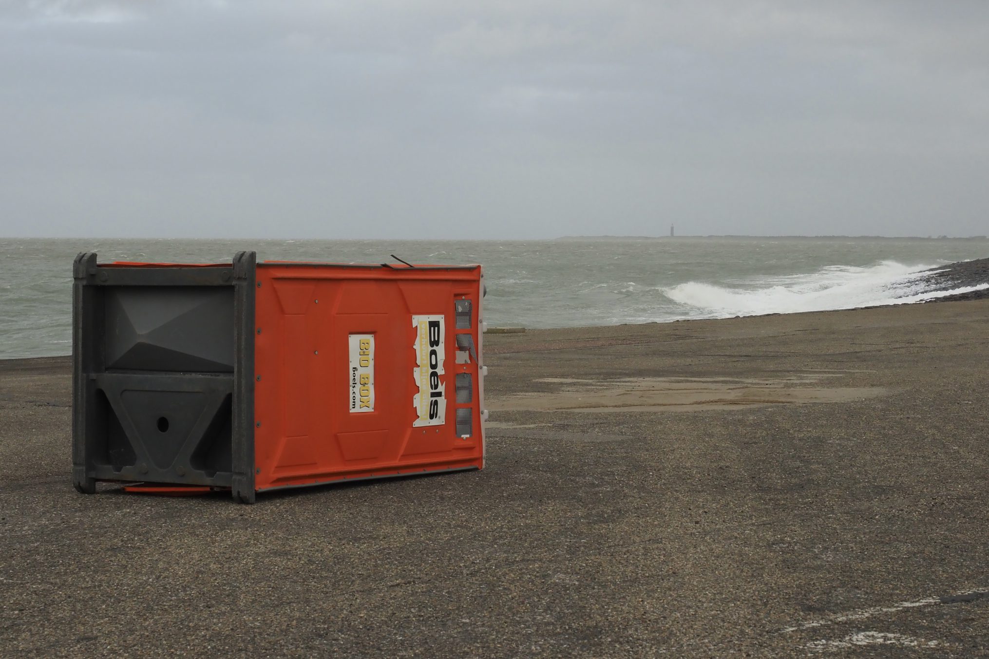 Even verderop kwam ik dit omgewaaide toilet tegen. Windkracht 7 was ook deze plaats van retraite te machtig. Als er iemand in had gezeten, dan was hij vast in hoge nood. De omgewaaide doos rustte op de deur. Voelde geen aandrang om het verder te onderzoeken en heb het gelaten voor wat het was.