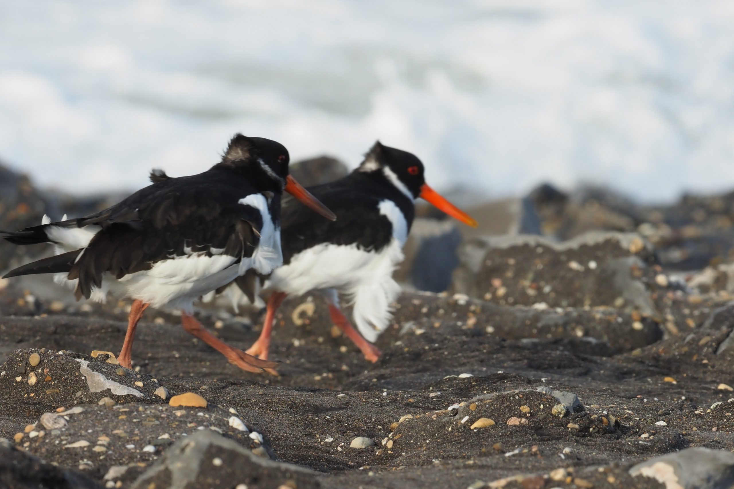 Maandag 2 november, 19 graden, warmterecord. Een strakke zuidwester beukte op de kust: windkracht zeven al vroeg in de morgen. Had mijn camera na lange tijd weer eens uit de kast gehaald en was naar de Brouwersdam gereden. Altijd een leuke plek om vogels te spotten. Vanwege het hoge water en de storm vielen er weinig soorten waar te nemen. Het lagere deel met voedsel zoals wier, schelpen en pokken lag onder water en door de wind was het er ook niet echt aangenaam. De meeste vogels hadden hun heil elders gezocht. Tegen het hogere deel van het talud zaten groepen scholeksters en drietenen weggedoken te wachten op betere tijden. Twee scholeksters hadden het idee opgevat zich te verplaatsen met de wind in de rug. Het bleek een minder goed idee, snelheid was nauwelijks te controleren en de veren waaiden van hun lijf. Jongens: gewoon blijven zitten met de kop in de wind, geeft een beter aerodynamica!