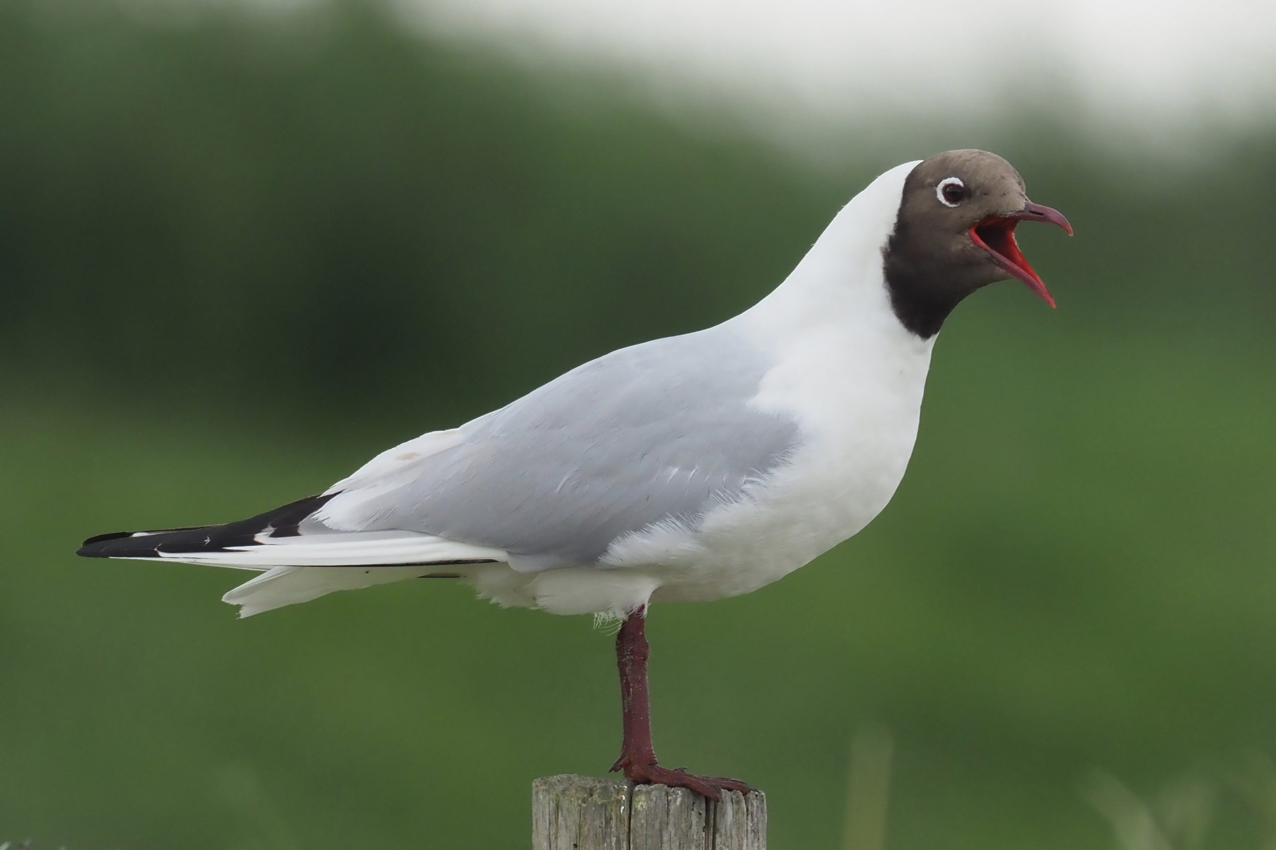 Volwassen kokmeeuw in zomerkleed staand op een paaltje. Een klassieke [...]