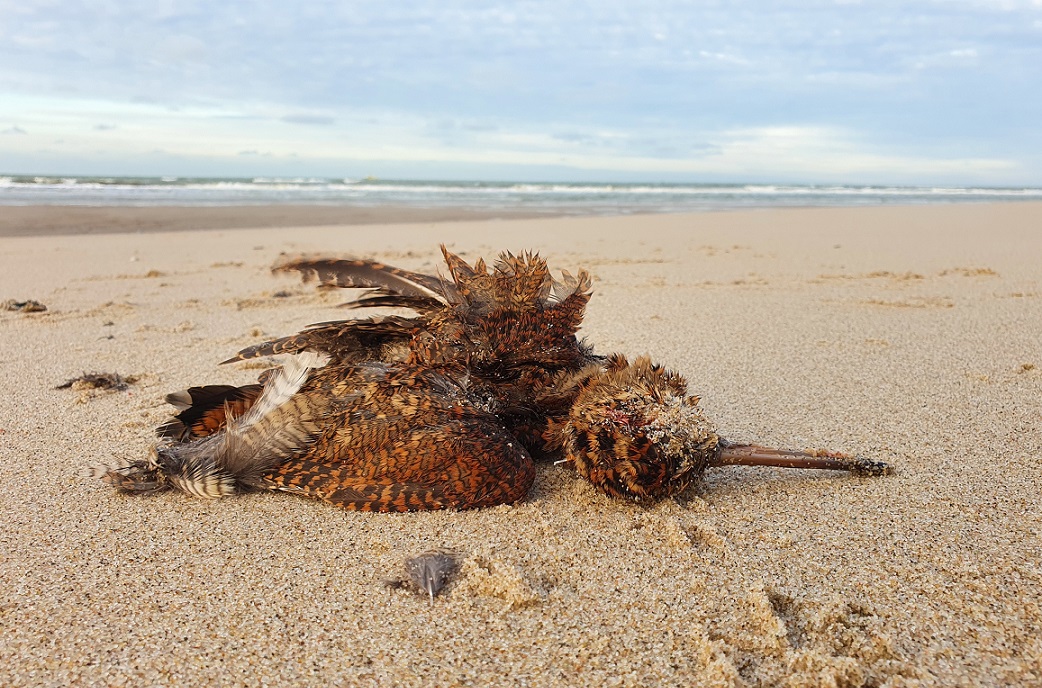 Houtsnip op het strand.