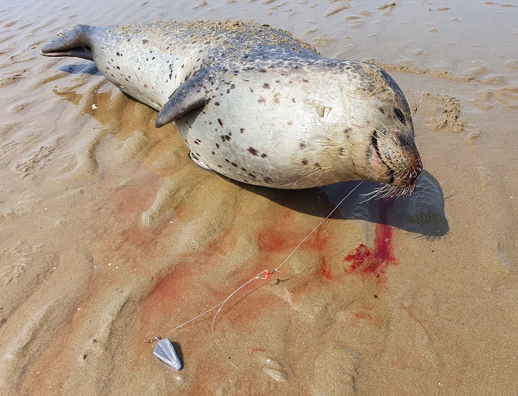 Een troosteloos gezicht, dit prachtige dier, liggend op de zij en uit de bek nog een gedeelte van het vistuig.