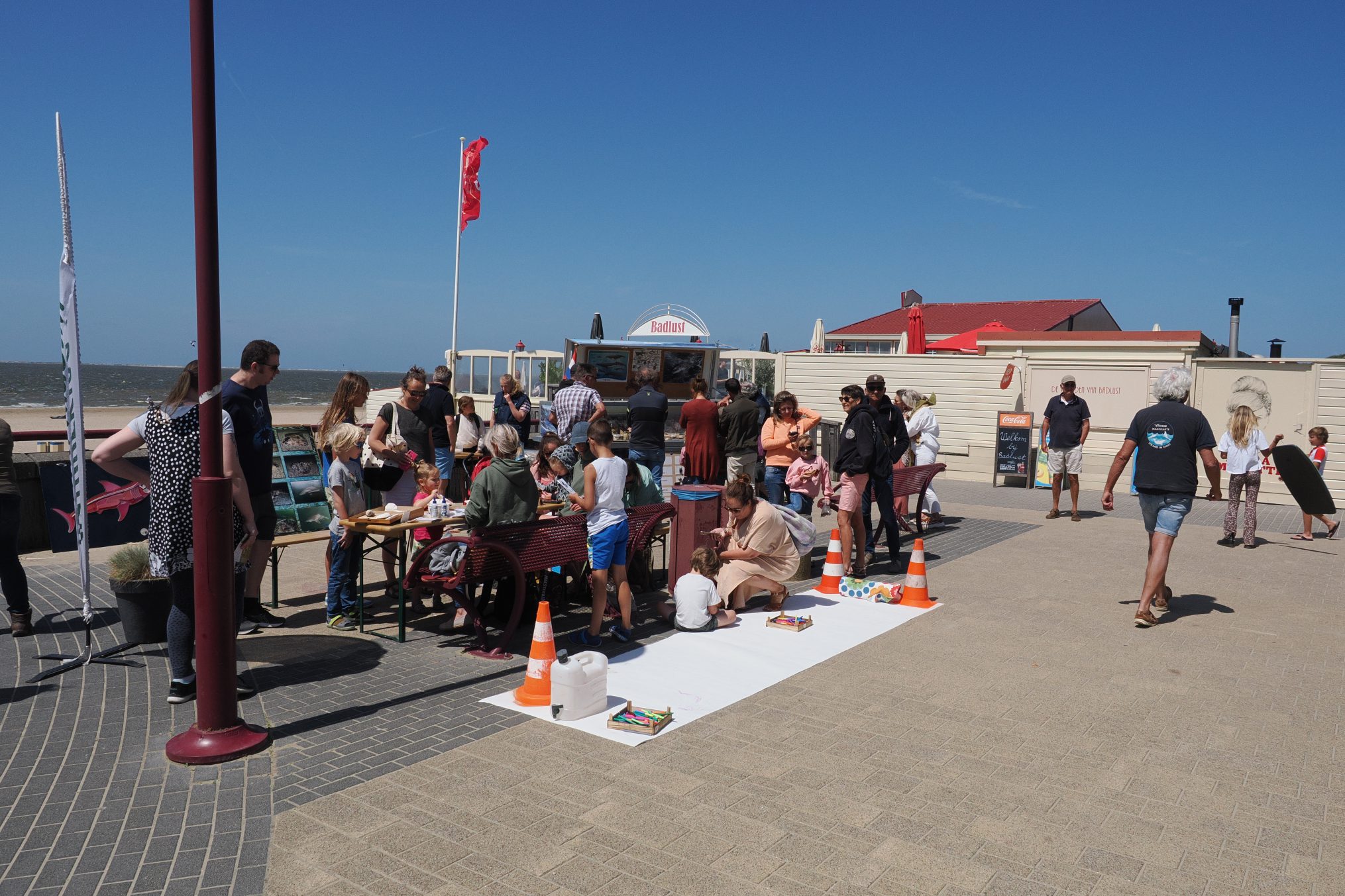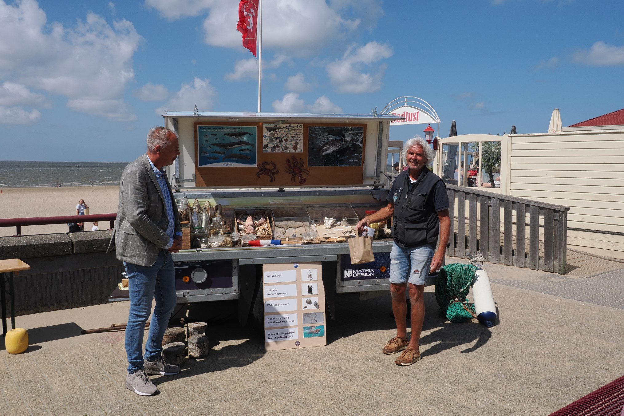 Op het strand stonden enkele strandwachters klaar om te helpen met het vangen van garnalen, platvisjes, krabben met behulp van een aantal grote kornetten.