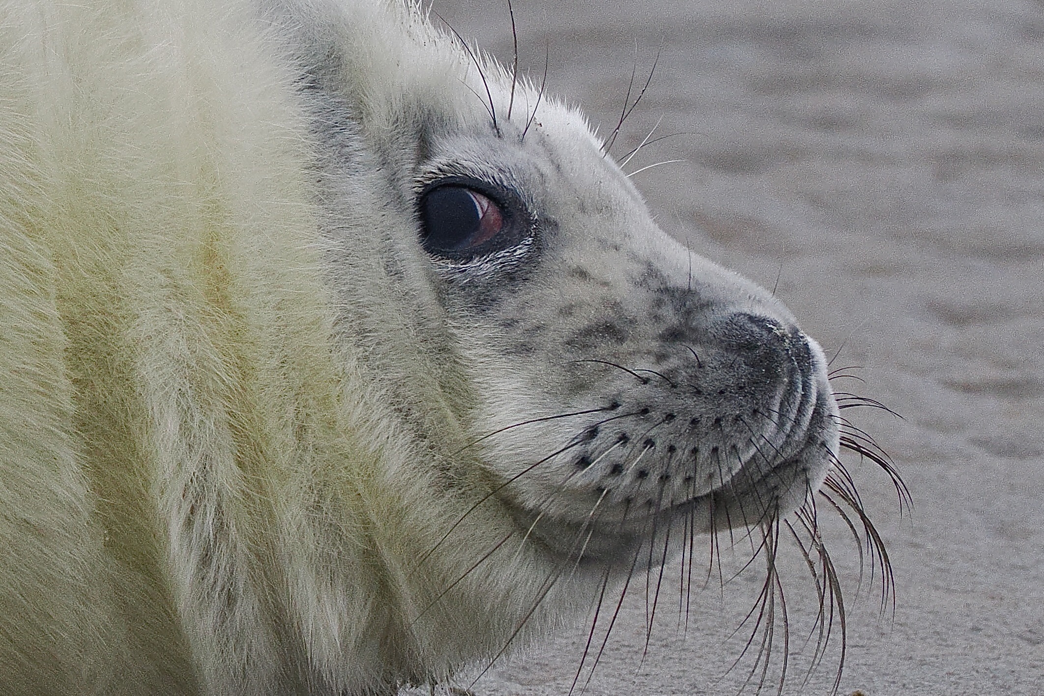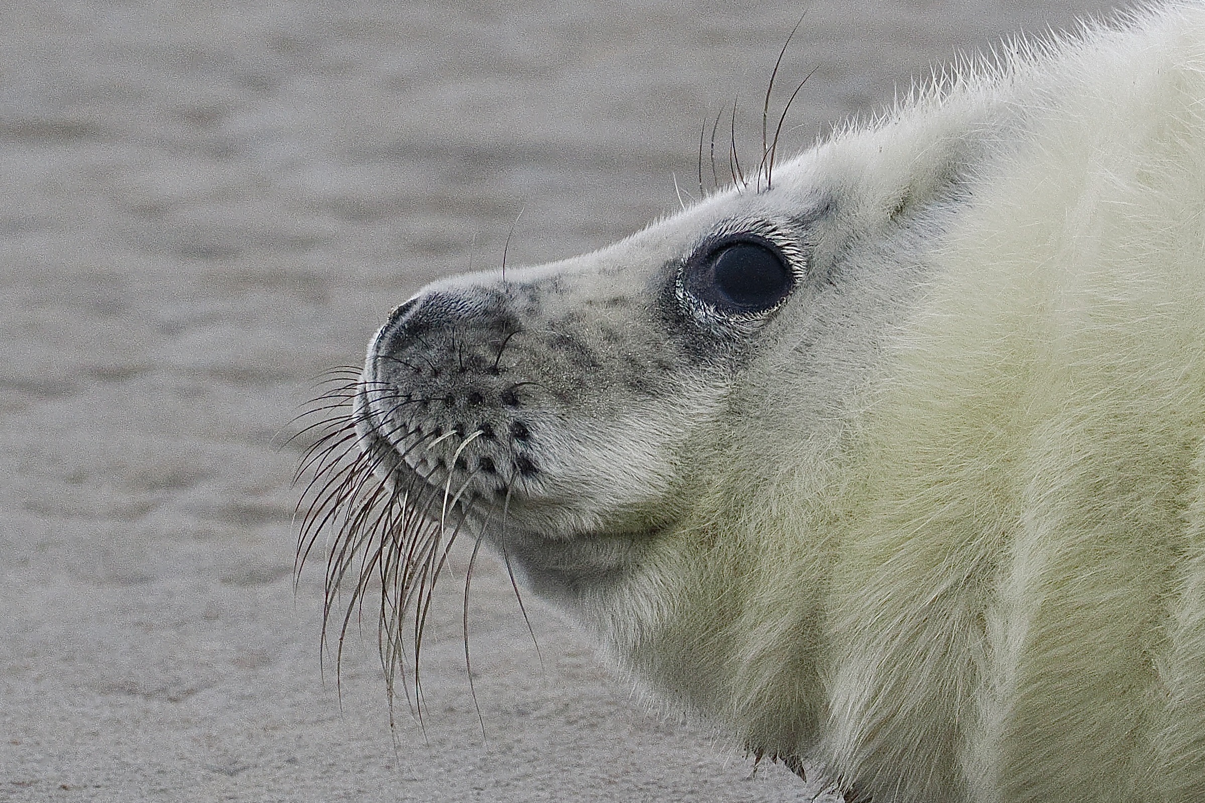 De snorharen van de zeehond. Op zeer jonge leeftijd van het dier al goed ontwikkeld en duidelijk aanwezig.