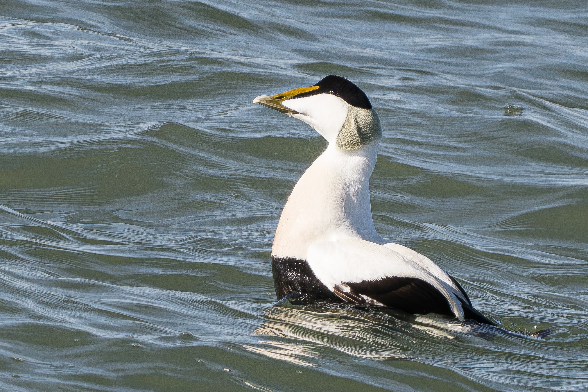 Een mannetje Eider richt zich op uit het water onder de kust van Schouwen. Zo’n beetje het zuidelijkste gebied waar ze te zien zijn. In de winter, overwinteraars langs de kust en op zee. Zomers een aantal broedgevallen op Neeltje Jans en de Maasvlakte. De Wadden zijn rijker bedeeld, maar we mogen hier toch niet klagen.