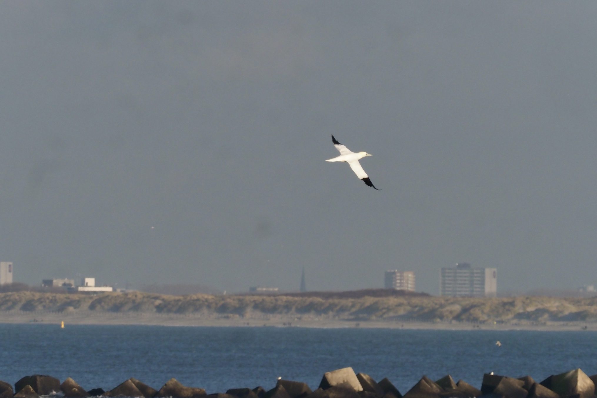 Maar een vliegende kraai vangt altijd wat. In de fraaie winterzon waren een 50 tal Jan-van-Genten aan het jagen in de monding van de Maas. Schitterende vogels die gedreven door de wind de kust van Nederland opzochten. Op bovenstaande foto een “derde winter” exemplaar herkenbaar aan de zwarte stippen op het kleed. En om het te situeren nog een volwassen vogel met op de achtergrond Hoek van Holland. De Jannen komen naar ons toe, scheelt weer een trip naar Schotland.
