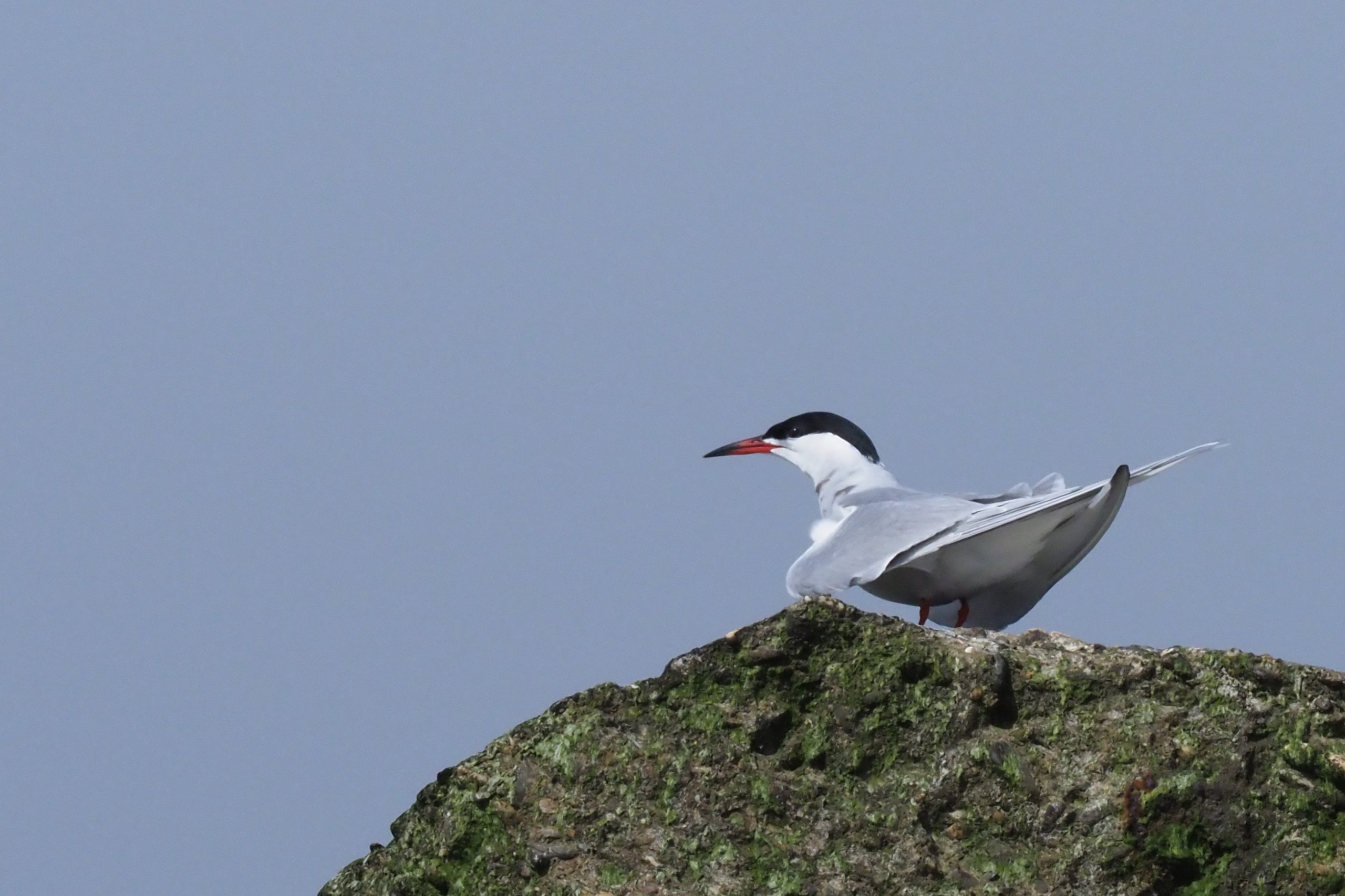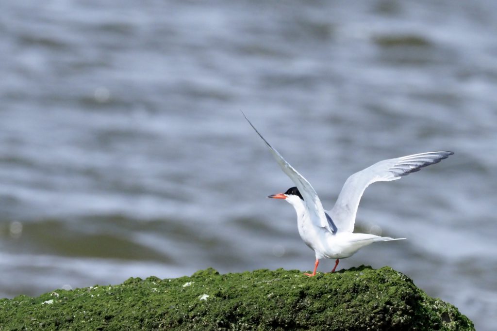 Het is bijna volle maan, twee dagen later kunnen we springtij verwachten. In de aanloop hiernaar toe zijn de hoog- en laagwaterstanden al op- en “af” gelopen en dat benutten we. Met eb kunnen we nu dicht bij onze klif komen zonder natte voeten te halen, er zijn ook voor een natuurliefhebber tenslotte grenzen. Het doel is de eiders te fotograferen op de verder gelegen rots, boven me cirkelen visdiefjes. Op de eerste rots landt plots de eerste visdief, gevolgd door een tweede. Door de knieĆ«n, scherpstellen en schieten, dan maar geen eider, maar wel een visdief en toch een paar natte poten.