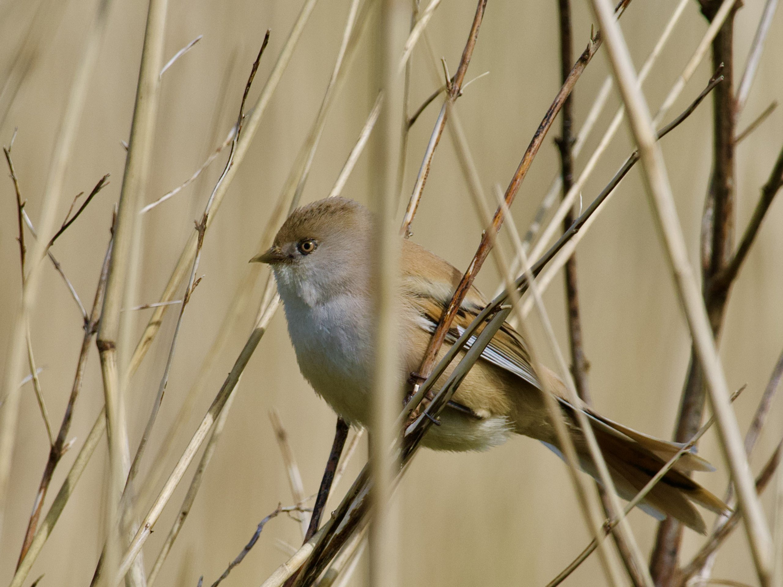 Nu is een goede voorbereiding van een foto expeditie het halve werk en dus braaf de nodige stappen doorlopen. Navraag gedaan over aanwezigheid, gebied verkend, juiste licht afgewacht, camera geprepareerd en op pad. Het vinden van de soort viel mee, al snel dook een koppeltje op die druk heen en weer vloog boven het rietlandschap met een beweeglijkheid die niet onder deed voor de wuivende pluimen bij de harde wind. Een combinatie waar de software in camera en hoofd niet tegen opgewassen was. Scherpstellen lukte wel, maar pas na het vertrek van de vogel. En mocht het een keer meezitten dan bleek bij nadere controle een rietstengel dichterbij de boel verstoord te hebben. Met een geitenbrei aan materiaal het rietlandschap verlaten. De enige opname die met wat smeergeld bij een soepele examencommissie een zes-min zou scoren laten we hier dan toch maar zien. Overal riet en daartussen een vogeltje. En dan nog slechts een Baardvrouwtje zonder baard. Mislukte jacht, verloren middag.