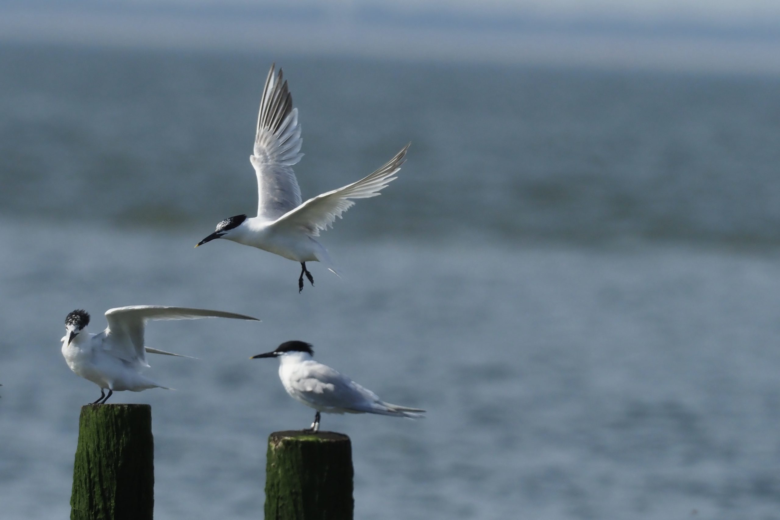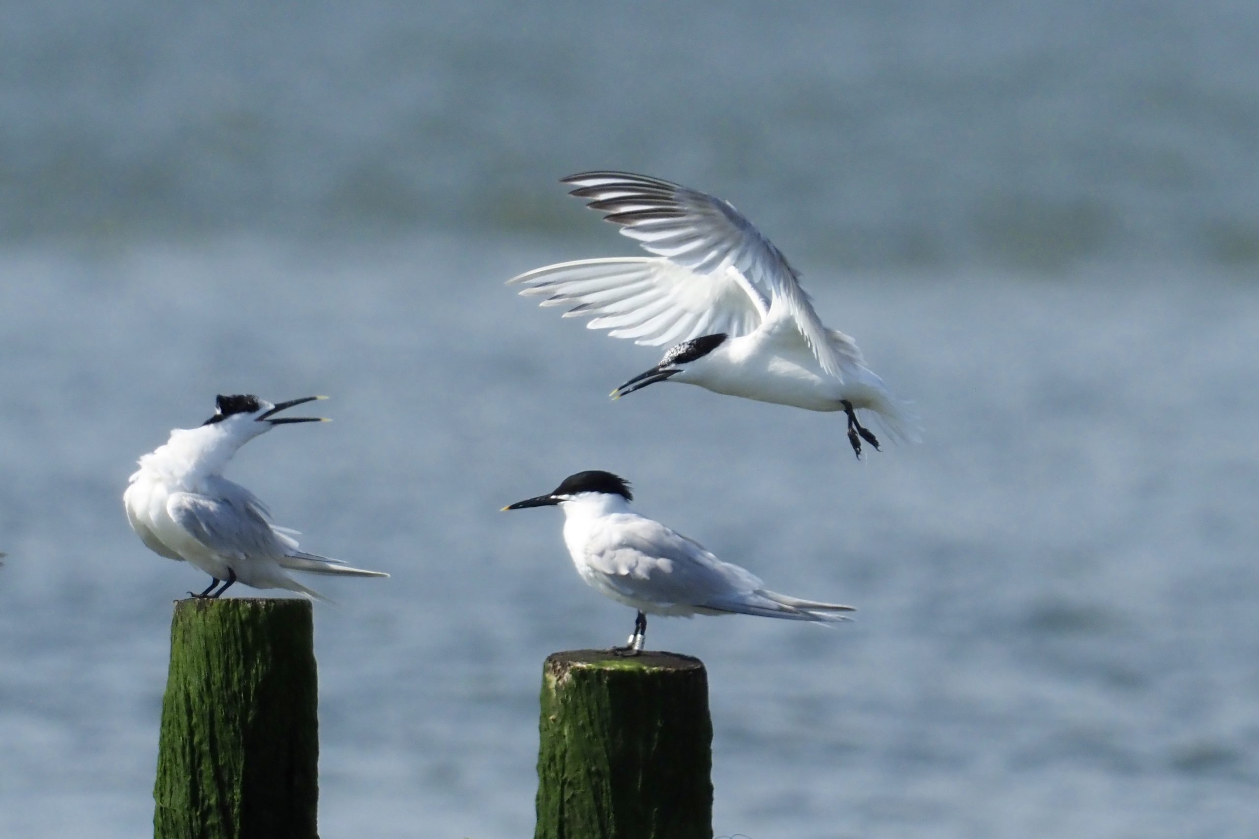 Ja, die mooiste paal. De rechter paal stond het verst in zee en was de “place to be”. Althans zo leek het in het uurtje dat ik de sterns zat te volgen. Was het omdat deze het dichtst bij potentieel voedsel zat? Er werd echter niet in de directe omgeving van de paal gejaagd. Gaf het de meeste afstand tot de wandelaars en hun honden? Of was het het beste uitzicht? Ik denk een combinatie van de laatste twee. Meermalen werd een aanval op de uiterste palen ondernomen, waarbij het leek alsof rechter stern een uitstraling had van onaantastbaarheid. Nummer twee moest het ontgelden en werd verjaagd door een indringer die op zijn beurt zich maar ternauwernood kon handhaven door zijn medeaanvaller af te slaan. Groepsgedrag met een pikorde, niets menselijks is de stern vreemd!