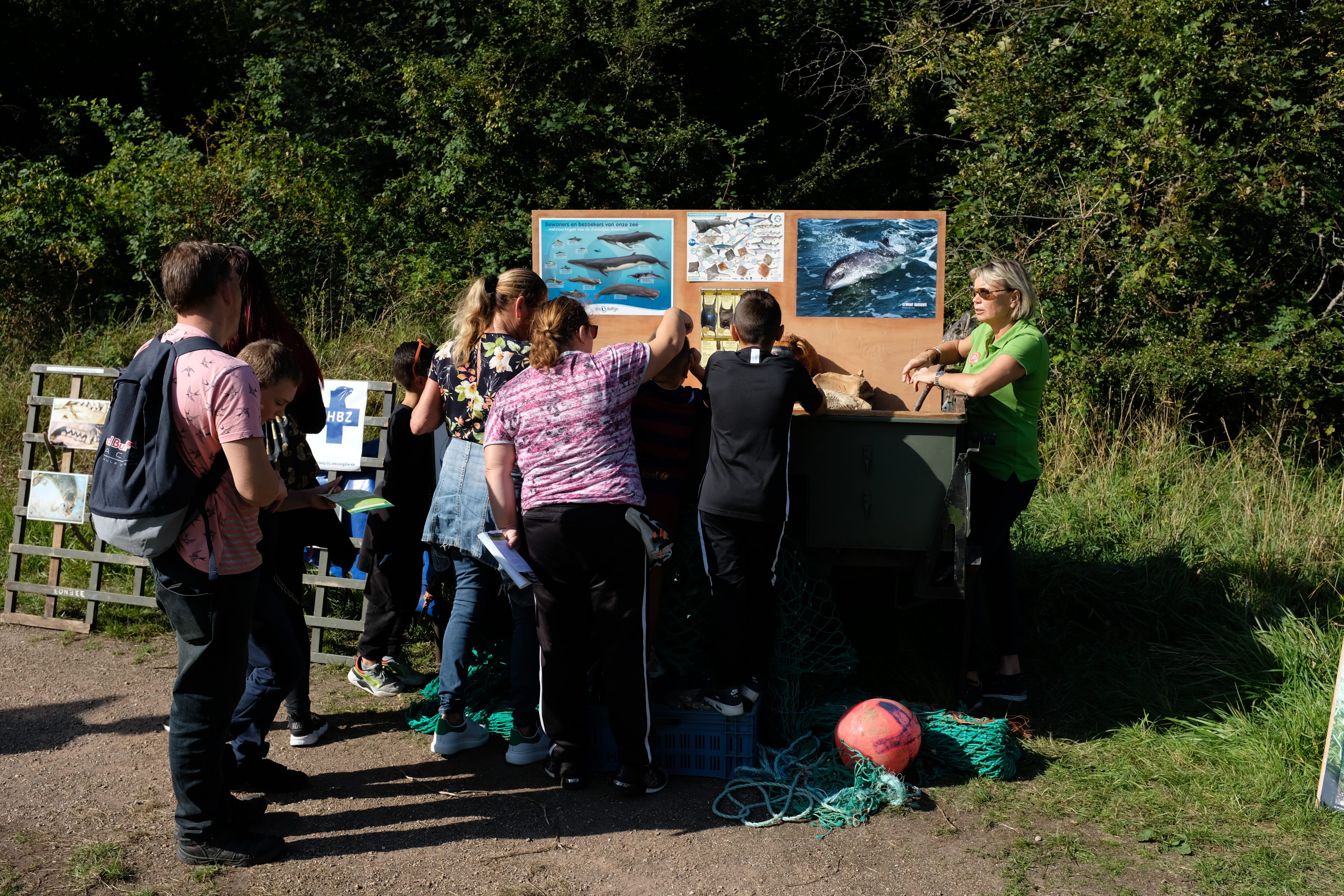 Op deze zonovergoten middag in de duinen van Voorne waren we aanwezig op de Duinendag van het Zuid-Hollands Landschap. Een evenement waarbij bezoekers van de duinen van Voorne een wandelroute konden volgen langs een tiental posten waar alle aspecten van het kustgebied aan de orde kwamen. Vanzelfsprekend namen wij het leven rond de vloedlijn voor onze rekening, maar ook een onderwerp zoals het afval kwam aan het bod. Een stroom van bezoekers passeerde tussen twaalf uur en half vijf onze kraam en kon zich verbazen over fossiele walviswervels, mammoetkiezen, roggeneieren en verhalen over zeehonden. Dit met als doel de nieuwsgierigheid naar meer aan te wakkeren. We hopen en denken dat menigeen er nog eens aan terugdenkt….