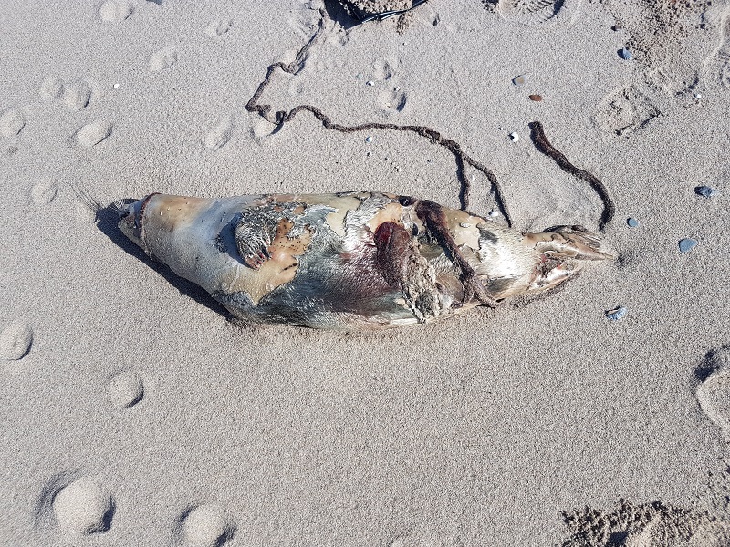 Een onvolwassen gewone zeehond lag in verre staat van ontbinding op de vloedlijn.