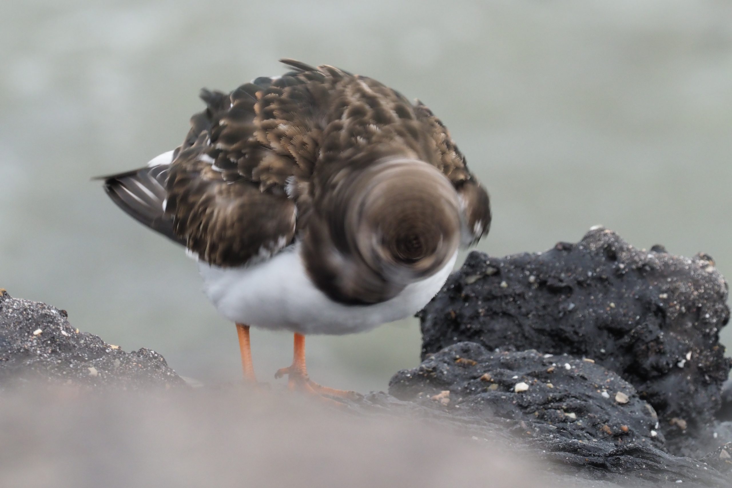 Een steenloper aan de oever van de Oosterschelde betrapt terwijl hij/zij bezig is met een poetsbeurt. Toilet te maken om het wat chiquer te zeggen. De veren worden gepoetst en de kop wordt geschud om alles weer op hun plaats te laten vallen. Noodzakelijke actie om de boel in conditie te houden, voor het vliegen, de isolatie en het verwijderen van parasieten.
