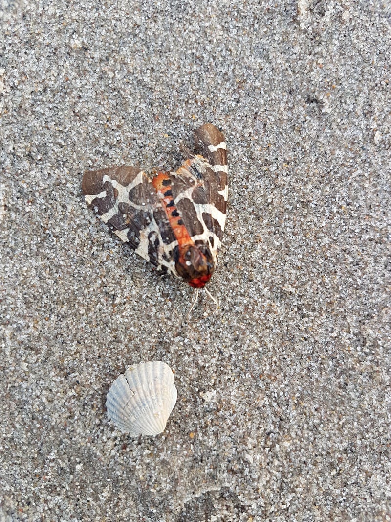 Deze nachtvlinder, met tijgerprint, lag gesneuveld op de vloedlijn.