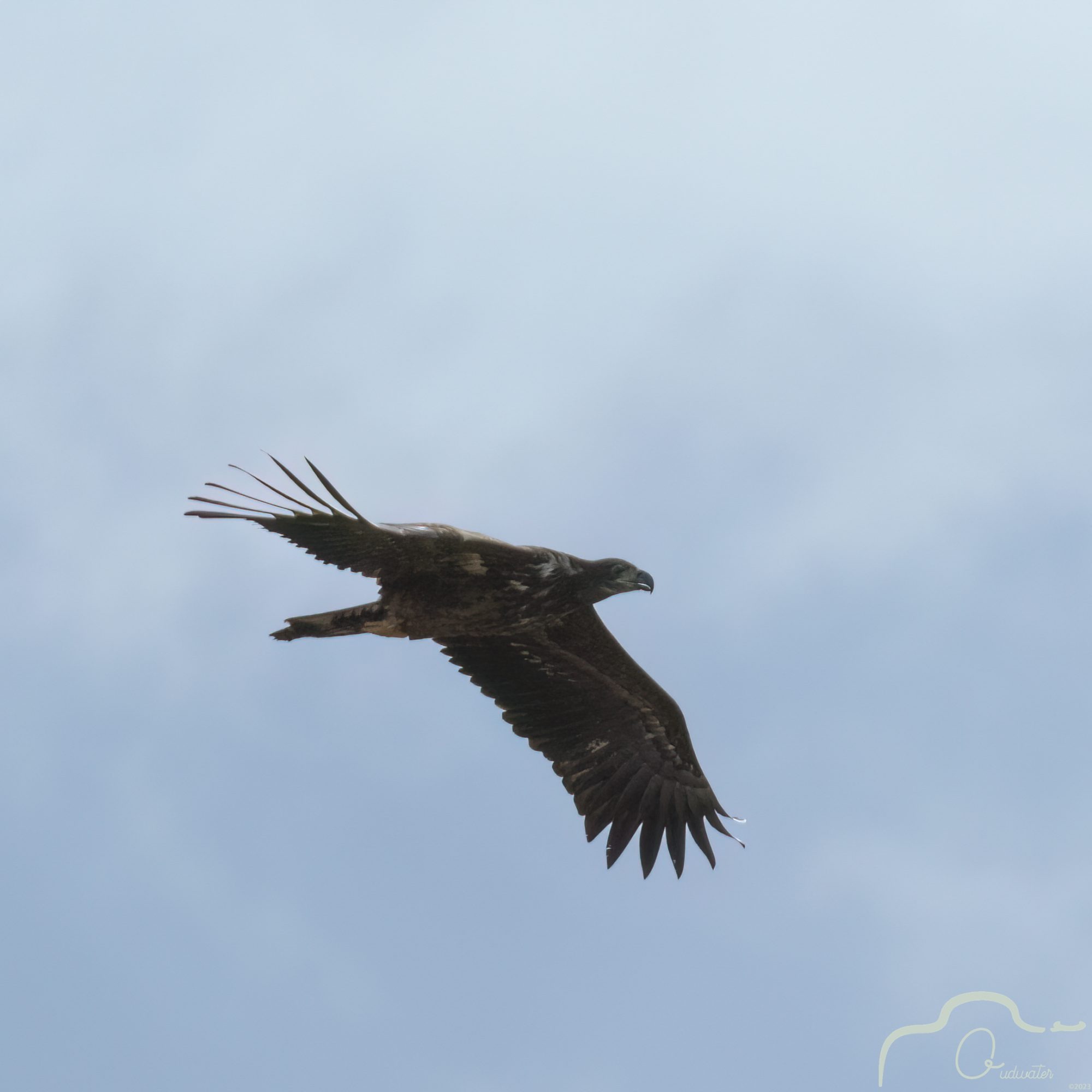 Ik draai me om en ja hoor daar komt de jonge zeearend aan, heel rustig flappend richting zee.