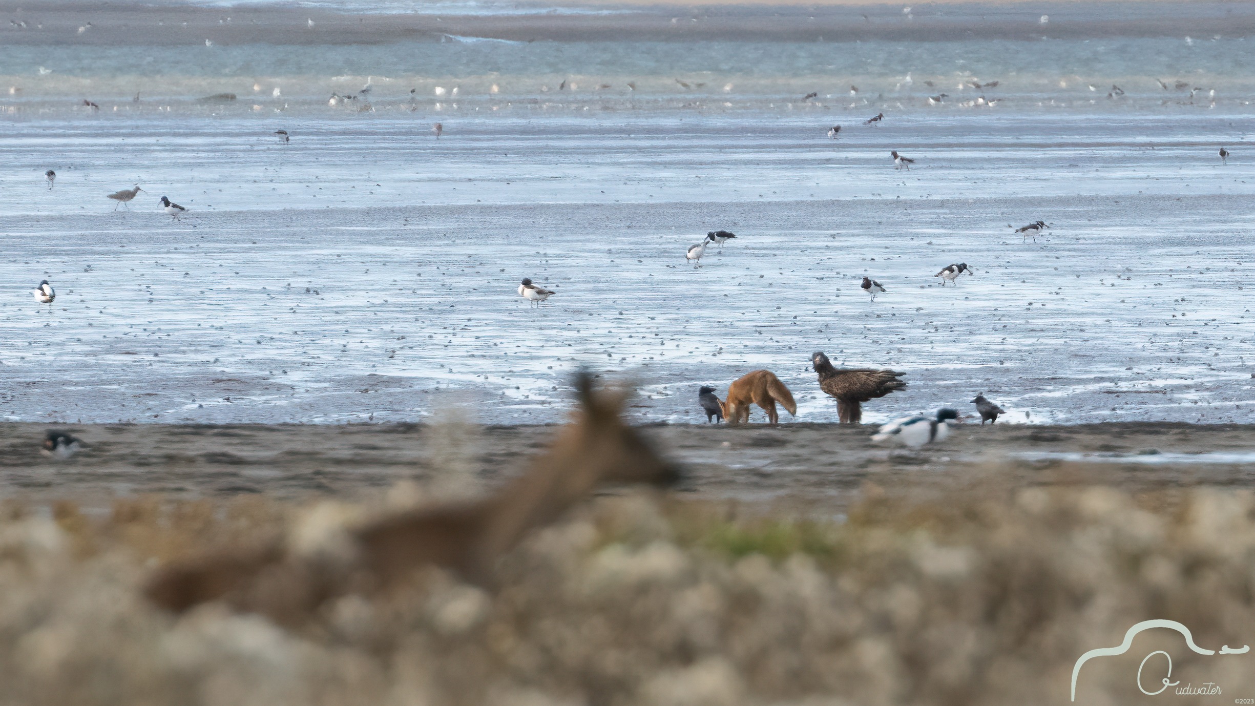 Tijdens ons praatje ziet ze een vos lopen over het strand, erg ver weg maar toch probeer ik deze struiner op de foto te krijgen.
