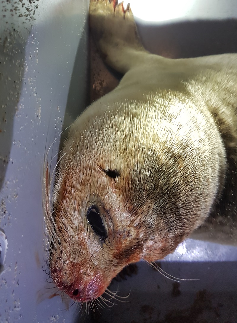 De onvolwassen, gewone zeehond had behoorlijk wat bloed om de bek en was erg benauwd.