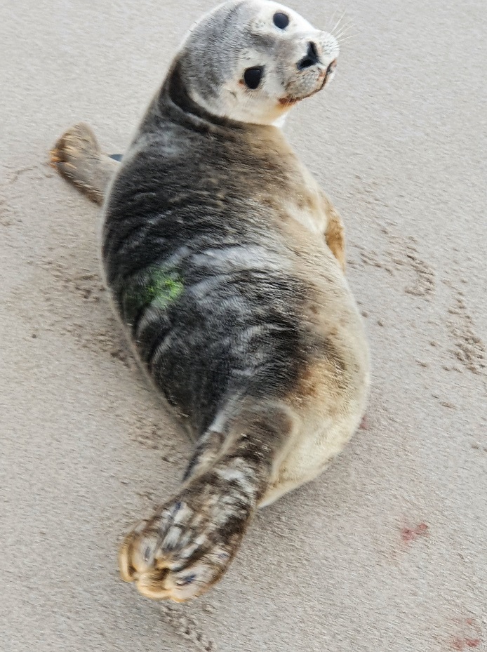 Deze jonge zeehond is enige dagen geleden gemerkt met een gele stip op de rug. Dit om herkenning en observatie makkelijker te maken. Het dier is daarna en tijdje in de gaten gehouden.