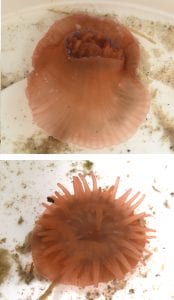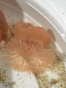 Op het Maasvlaktestrand vonden we bij eb de Rode paardenanemoon (ook wel Zeeroos) en de Zeeanjelier. Twee soorten die in een getijdengebied kunnen leven en bij laag water als een klein bolletje of hoopje ‘snot’ blijven liggen of drijven. Zo troffen we ze ook aan, tot ze in ‘ruimer sop’ kwamen.
