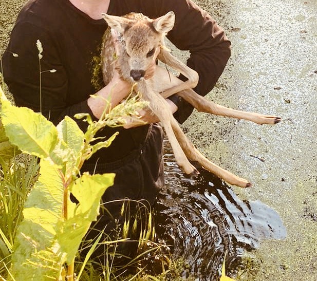Gisterenavond zoals zo vaak even een rondje. We zien een Reegeit staan maar erg onrustig, heen en weer rennen. We doen het raampje open om haar op de foto te zetten en horen haar blaffen. Meestal een teken van alarm, maar rennen dan vaak de beschutting in. In dit geval hoorde wij een kalfje gillen Even gewacht maar kwam niet naar z’n moeder. Omdat er een sloot ligt in de richting van waar het geluid kwam besloten om het kalfje te zoeken.