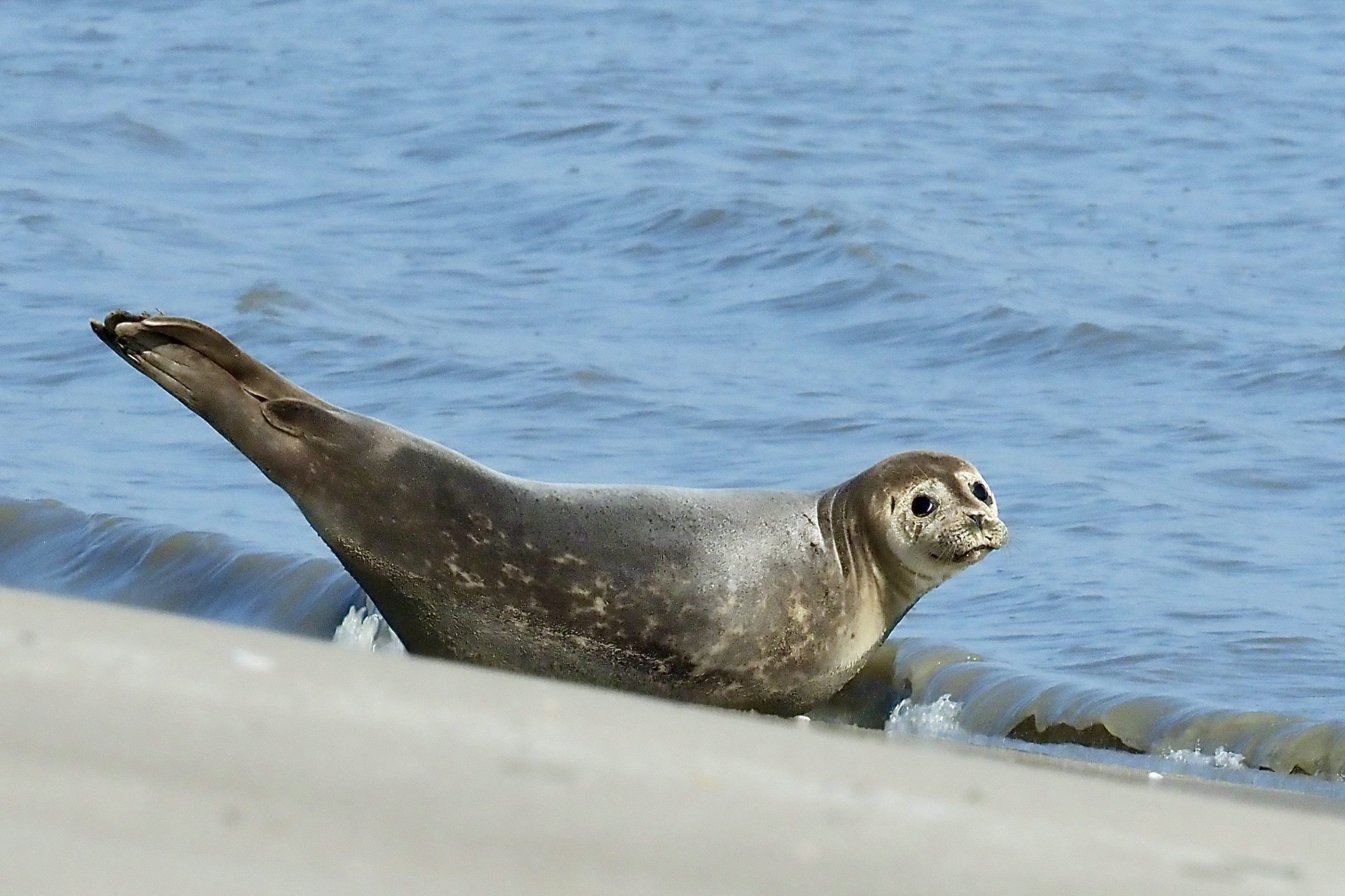 Zeehond lag in zijn typische bananen houding op te warmen. Hoofd en flippers zijn minder beschermd tegen de koude dan het met een dikke laag spek beklede lijf. En dan is het lekker om in de stralende zon deze lichaamsdelen eens lekker te laten drogen en verwarmen.
