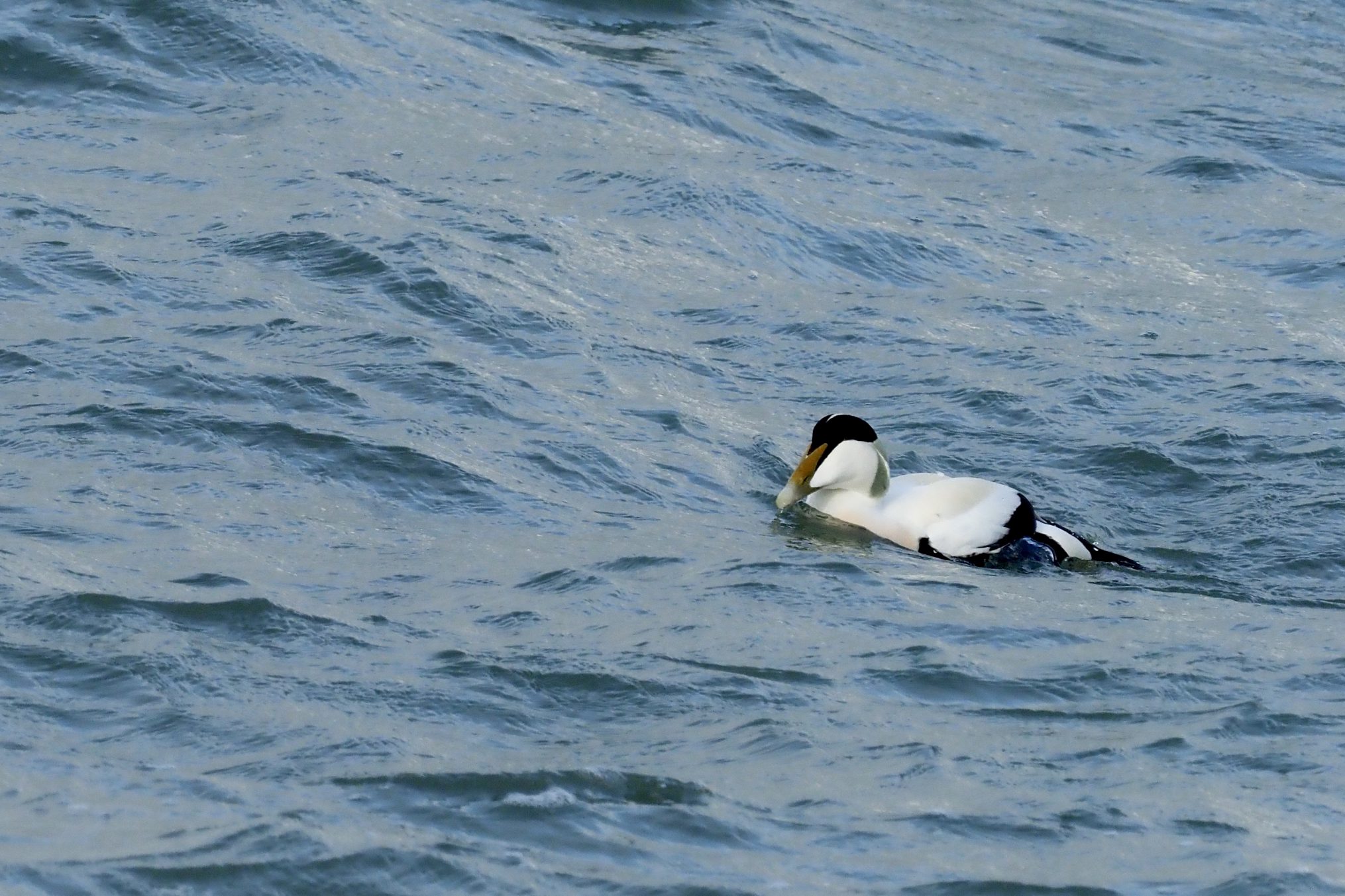 Met de moderne fototechniek wordt het vastleggen van het juiste moment ogenschijnlijk makkelijk gemaakt. Je ziet het object en drukt af en als was het een machinegeweer worden er in 1 seconde worden wel 10 opnamen gemaakt. Thuis kan je dan rustig de beste uitzoeken. Zelf ben ik meer van de ouderwetse school en maak de opnames 1 voor 1. Je werkt dan met meer concentratie en het scheelt heel veel uitzoekwerk thuis achter de computer. Maar dan zit je er wel eens net naast. Zoals bij deze eider die ik wilde fotograferen op het moment dat hij zijn rug kromde om te gaan duiken. Hij dook sneller dan ik kon afdrukken.
