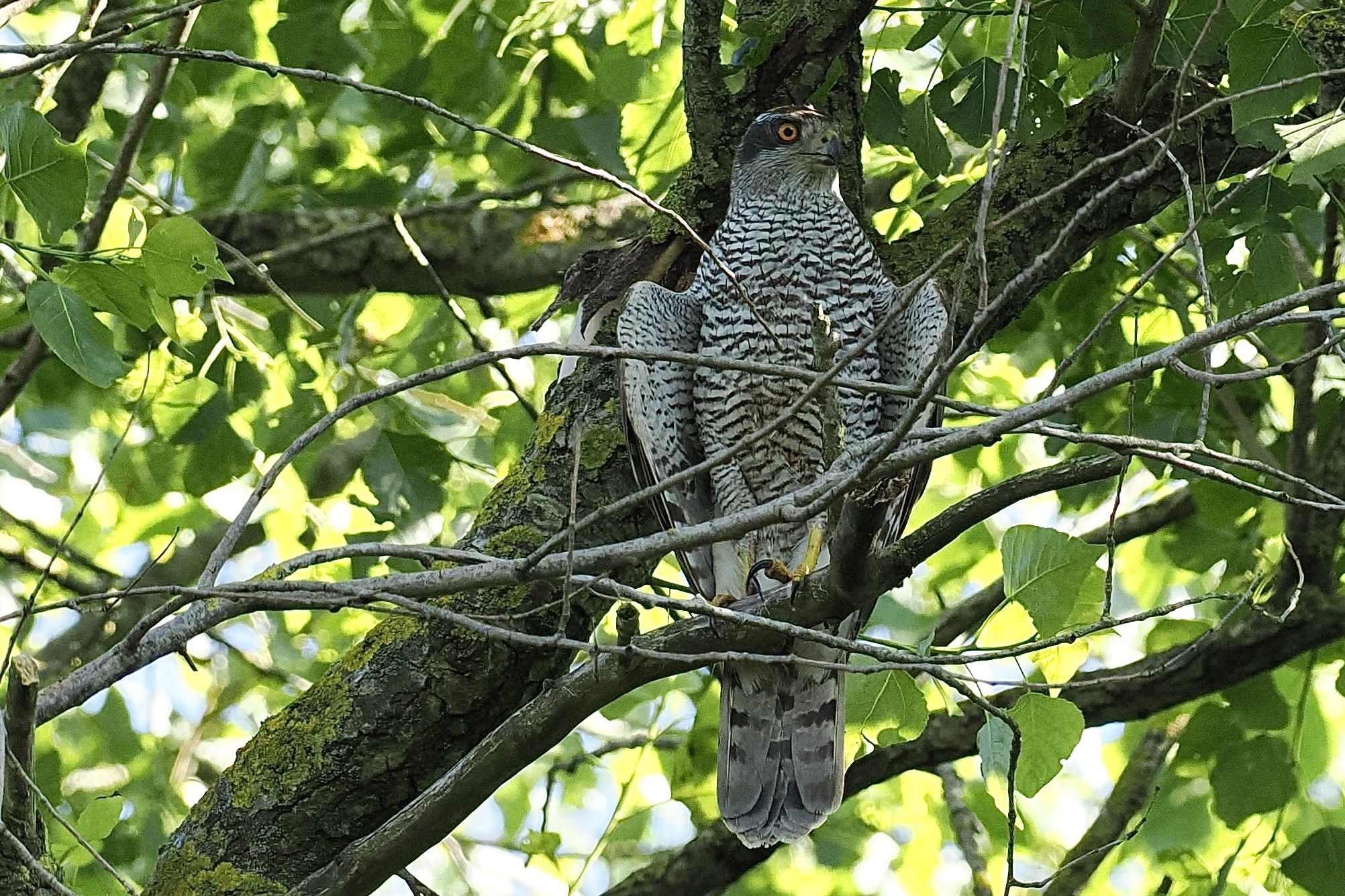 In de binnenduinen van Voorne neemt een Havik een momentje rust op een tak in de buurt van zijn nest met jongen. Vermoedelijk zojuist een prooi bezorgd, het gepiep en gekrijs was verstomd. Even opladen en dan weer op pad voor nieuwe aanvoer.