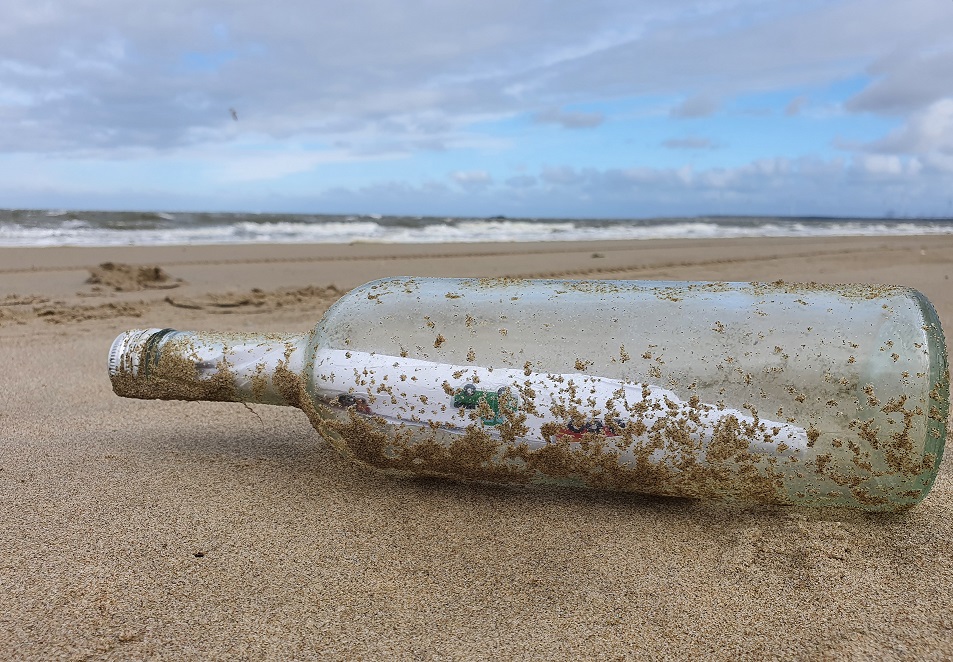 Op de vloedlijn, ter hoogte va de Groene Punt zag ik deze fles liggen. Niets bijzonders eigenlijk, tot ik het opgerolde papier zag, dat in de fles was gestopt.