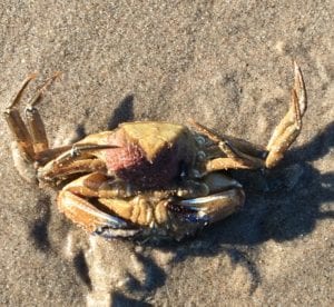 Ze lag er wat ongelukkig bij op haar rug toen we haar troffen, deze prachtige Fluwelen zwemkrab. Na de zachte winter van het afgelopen jaar draagt zij -nu in maart- al eitjes onder haar puntstaart! Dit is mooi te zien op de 2e foto (de rode massa), waarna we haar uiteraard weer op haar 10 pootjes hielpen.