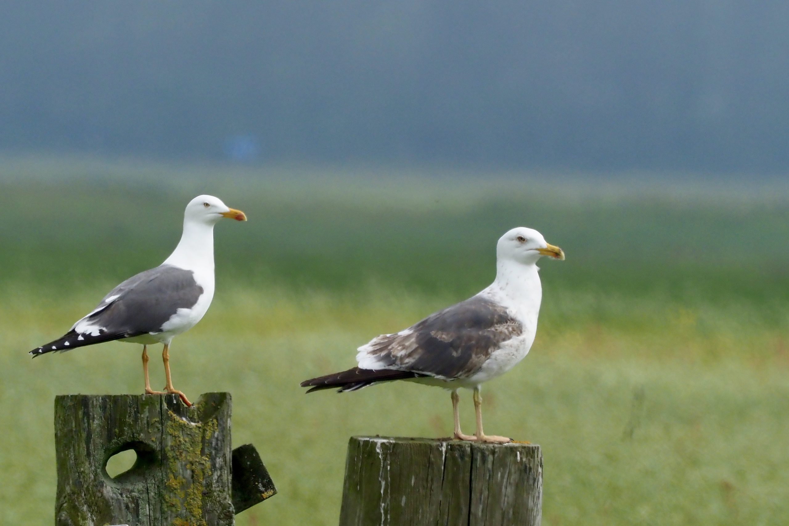 Twee kleine mantelmeeuwen zitten aan de rand van de weilanden op de uitkijk. Aan het kleed van de rechter te zien nog vrij jonge exemplaren die nog niet belast zijn met de zorgen van een nest jongen. Vanaf hun paaltjes op de uitkijk, niet naar dreiging maar naar kansen op een te verschalken kuiken. Overigens leek de predatie door roofvogels en meeuwen en kraaien beperkt door het assertieve en alerte gedrag van de weidevogels. We zagen kiekendieven het hazenpad kiezen belaagd door scholeksters en tureluurs. Vossen ontbreken op het eiland.