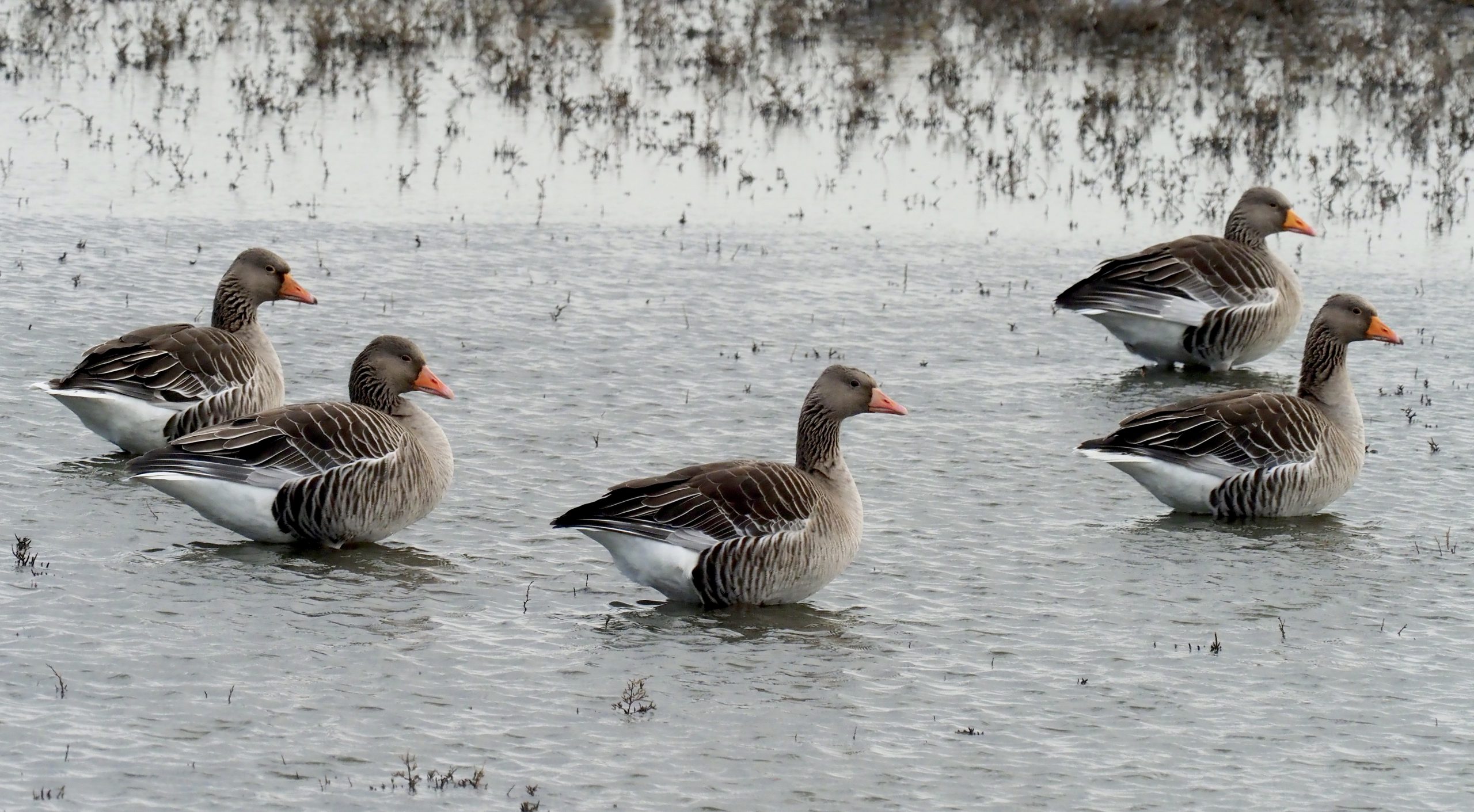 Als je dan als gans getooid wordt met de naam ” Grauwe” sta je al op 1-0 achterstand. Toch jammer, kijk deze 5 exemplaren er eens op aan: goed geproportioneerde en subtiel getekende vogels. Met hun ingetogen kleuren en het strakke patroon een verrijking van het landschap. Het repeterende karakter van een groep ganzen vormt een schitterende stoffering van onze polders. Het is er nu de tijd voor om ze bekijken met de grote aantallen overwinteraars ( zo’n 500.000). Zo gewoon dat we er haast niet van opkijken, maar vergeet niet ze ook op detail te bezien.