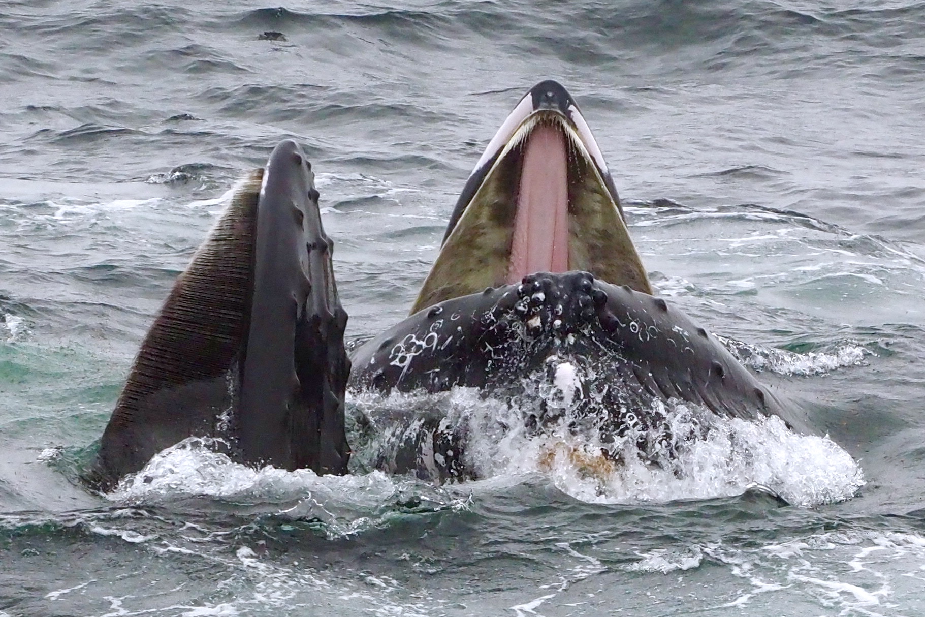 De bobbels op het lijf zijn geen pokken of wratten maar bevatten tastharen die bewegingen in het water kunnen detecteren. De bek kan wijd worden geopend zoals ook bij het linker exemplaar te zien is. Bij het rechter exemplaar kijken we tegen de bovenkaak aan. Ze waren bezig voedsel in te nemen, kril of een school vissen, die ze middels een luchtbellenbaan of bewegingen met hun staart of flippers weten te centreren aan de oppervlakte om ze daarna op te slokken.