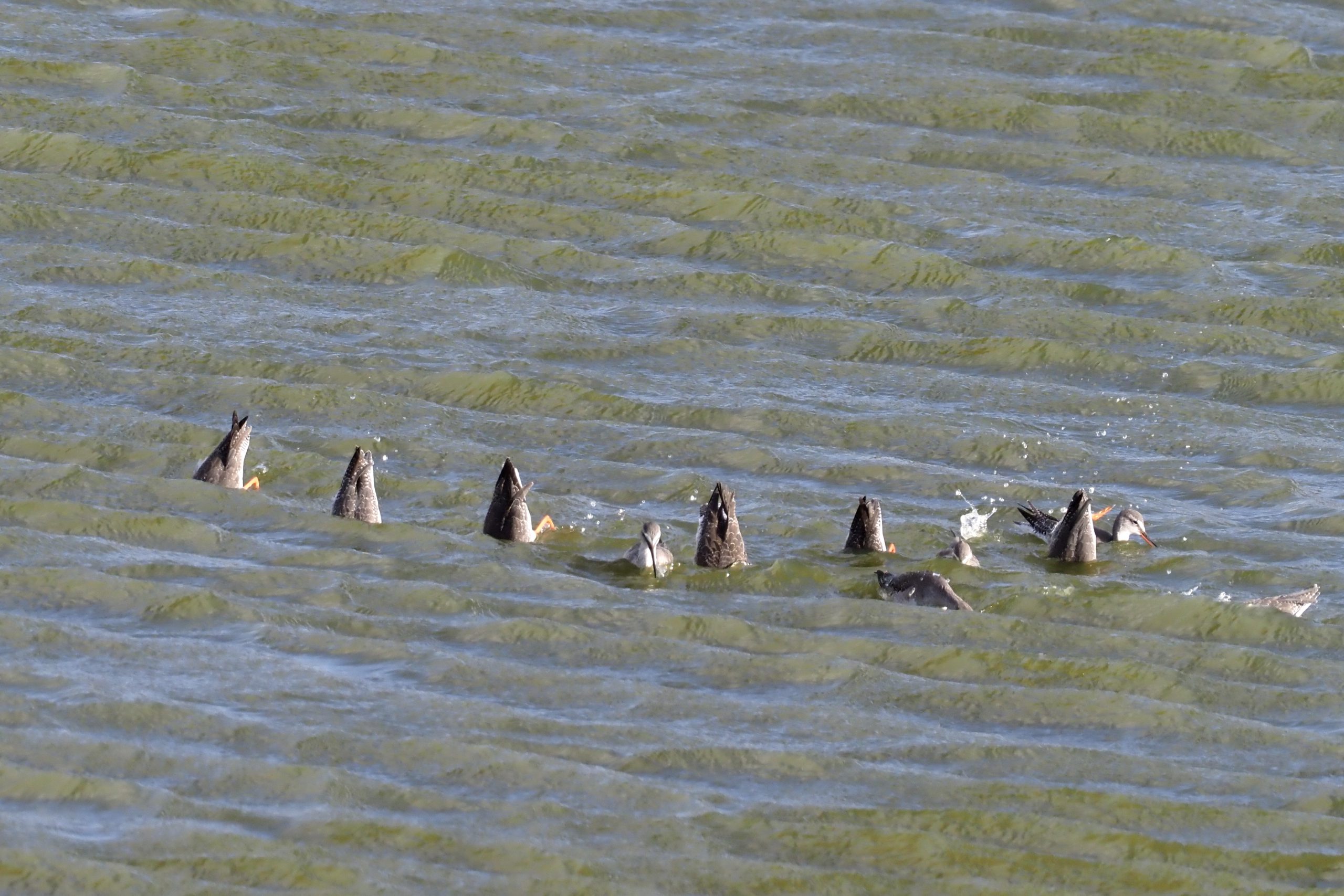 Grondelen kennen we vooral van eenden maar ook ruiters gebruiken deze techniek. Het woordenboek geeft als betekenis: “het met de kop en borst onder water zoeken naar voedsel op de bodem of beneden de waterspiegel”. Deze ondiepe plas is er ideaal hiervoor. Het door de wind onrustige water kleurt groen van de begroeiing 30 centimeter onder het oppervlak.