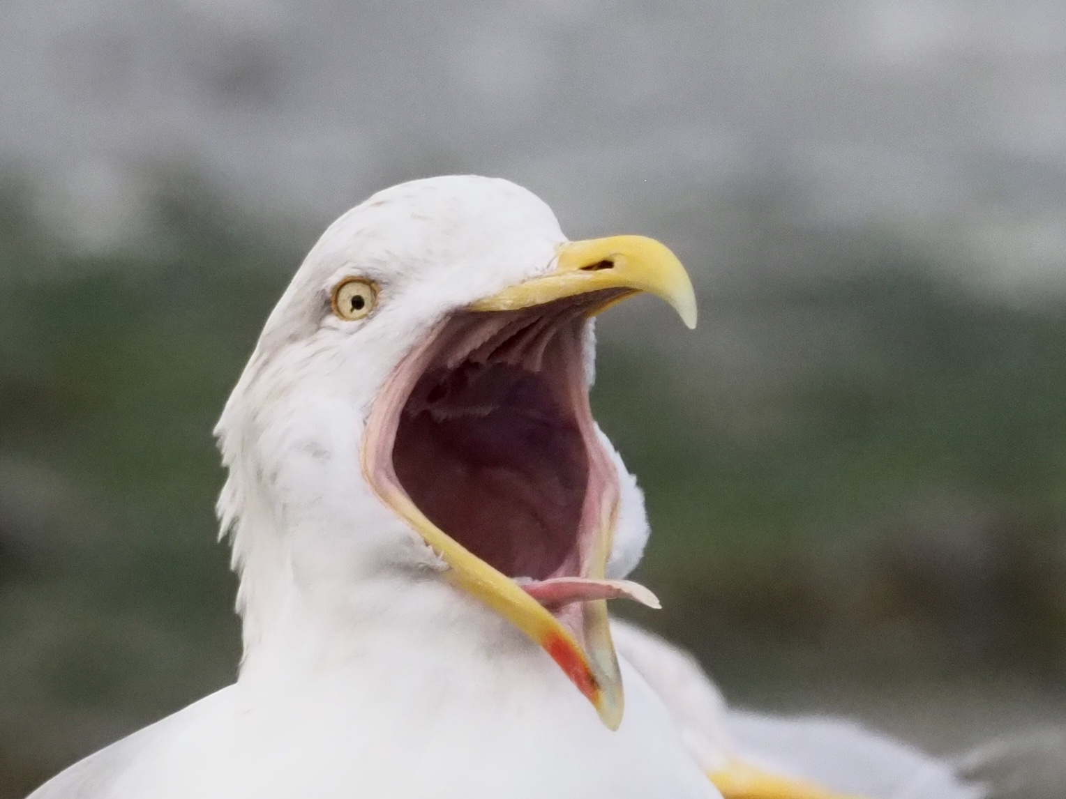 Binnen het dierenrijk staan nijlpaarden bekend om hun grote bek. Het enorm grote gapende gat dat verschijnt wanneer de kaken worden gespreid, imponeert. Een waardige tegenhanger hiervan binnen het vogelrijk is voor mij de meeuw. Waarom doet een vogel zijn bek open? Het zal wel met dezelfde motieven gebeuren als bij de mens: om te eten, schreeuwen of geeuwen. Deze was bezig met het tweede: schreeuwen. Meeuwen zijn koloniedieren en daarom is hard kunnen schreeuwen een must. Daarnaast moet je met een bulderende branding op de achtergrond je goed verstaanbaar kunnen maken: kortom binnen het selectieproces bij meeuwen is een grote bek een belangrijk item. Mag het geluid graag horen, zeker met de zee op de achtergrond. Het sfeerbeeld van de kust!