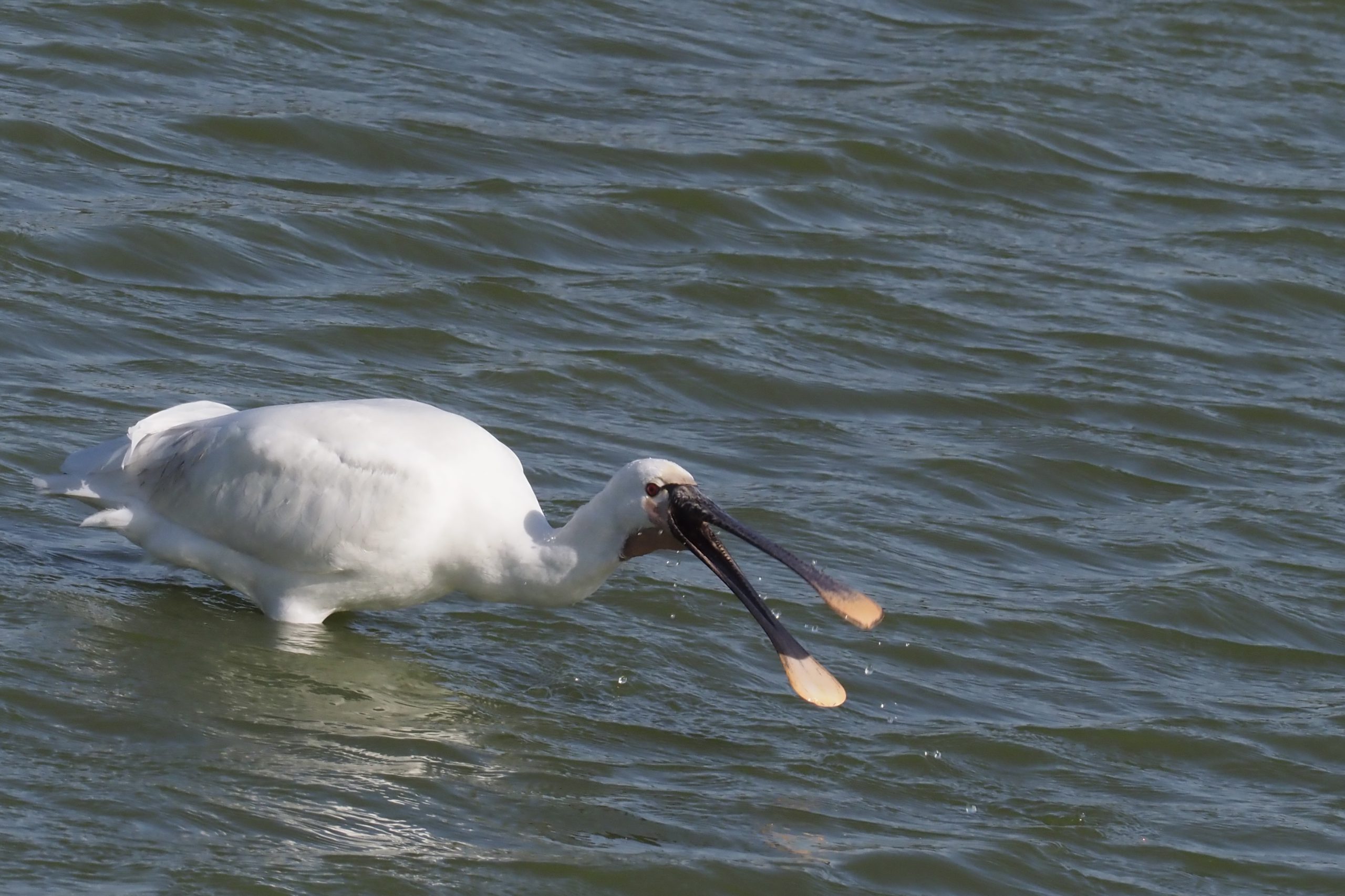 De imposante lepel blijft verwonderen. Hoe houd je dat gewicht in de vlucht netjes op zijn plaats, hoe sterk moeten de spieren van het scharnier in de kop niet zijn om de bek te laten klapperen. Het zwaartepunt ligt nogal excentrisch. Maar de praktijk laat zien dat het prima kan.
