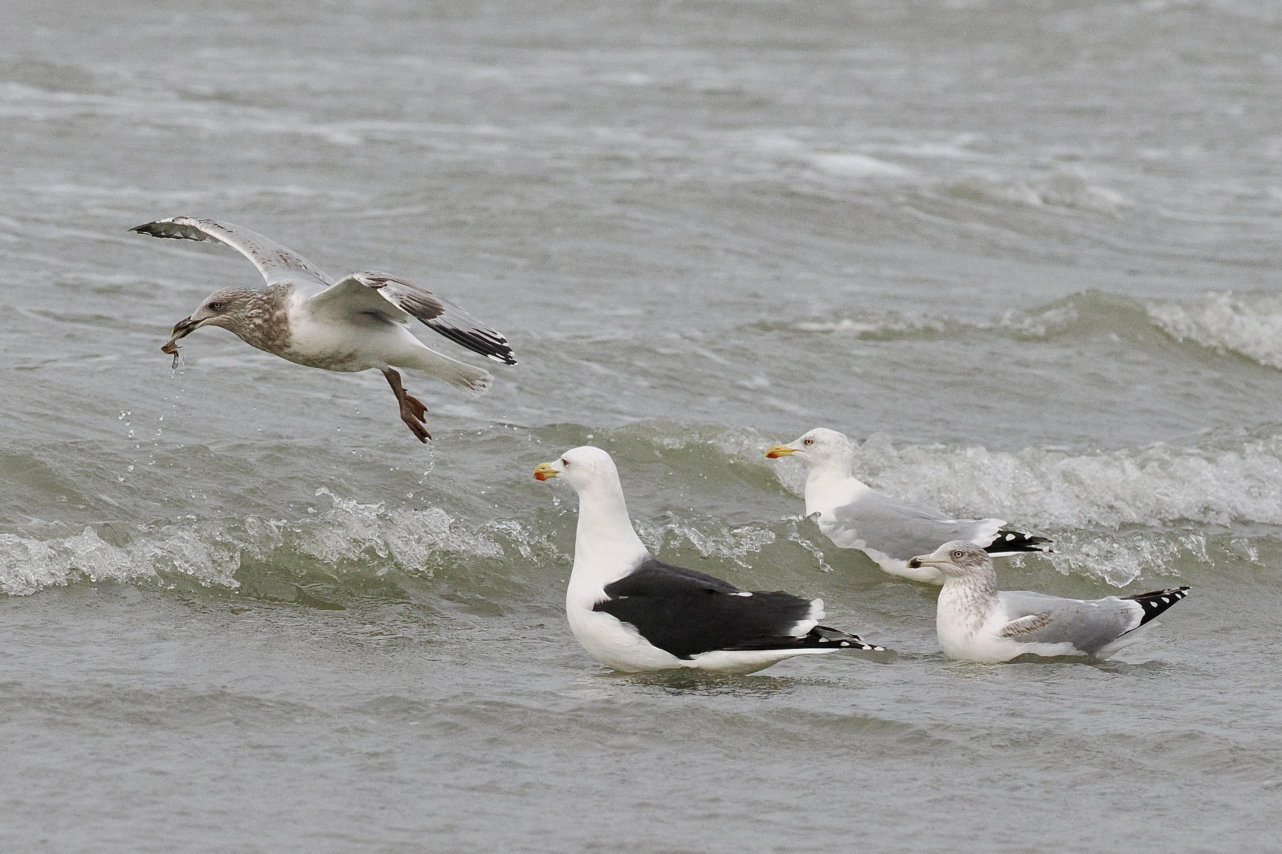 Een jonge Zilvermeeuw was de Grote mantelmeeuw en twee andere Zilvermeeuwen te vlug af. Vloog weg met een messchede in zijn bek. Grote kans dat het een Amerikaanse zwaardschede was, voor de kust massaal aanwezig.