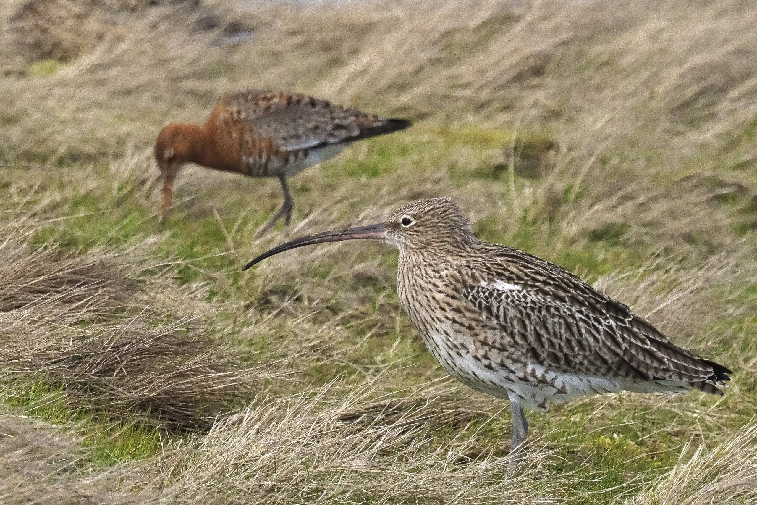Snel een plaatje gemaakt voor wat het waard was. Wulp op de voorgrond, scherp gesteld op de Grutto een paar meter verderop. Misschien wel een aardig prentje, Wulp onscherp en Grutto scherp. De eerste wel genoeg gezien deze winter, nu aandacht voor de ” nieuwkomer”.