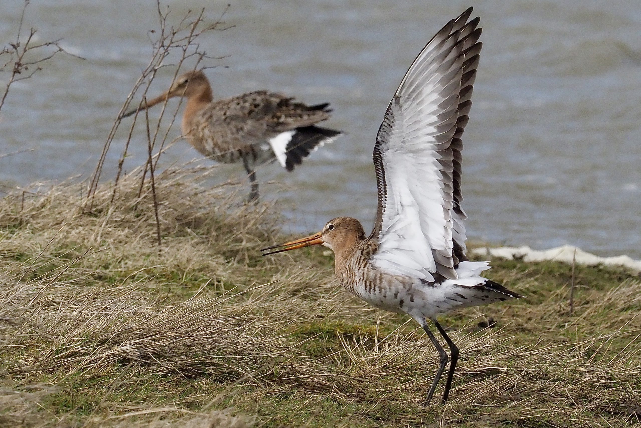 Twee Grutto’s zijn zojuist geland op de natte graslanden van Schouwen, mogelijk na een lange vlucht uit West- Afrika.