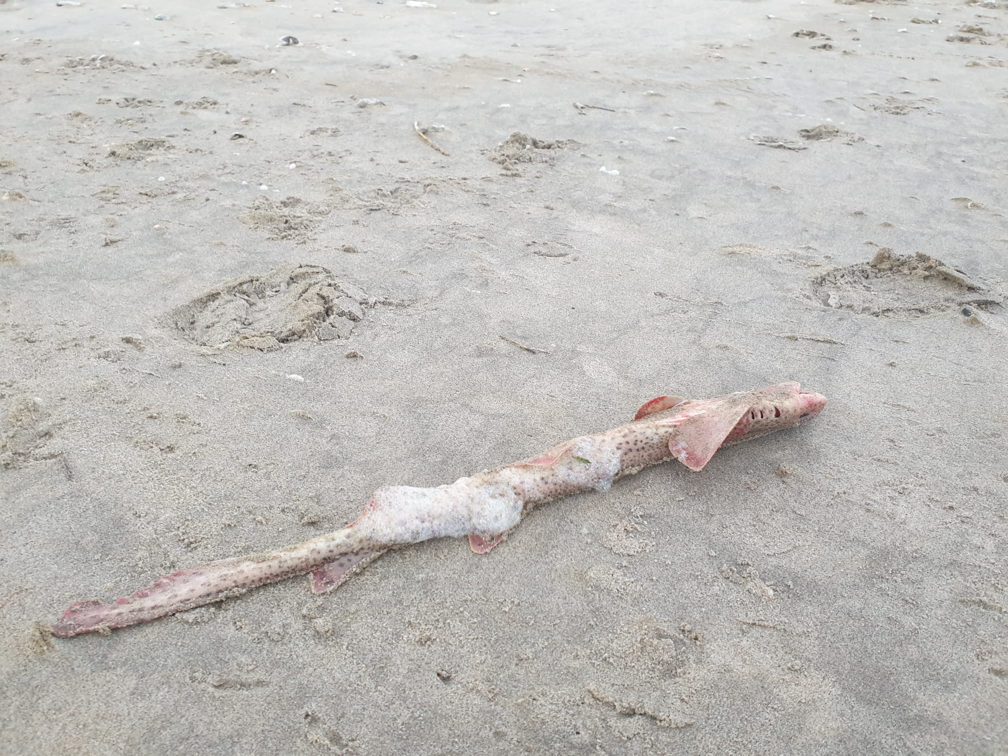 Terwijl Judith zich verbaasde over de omvang en het gewicht van de boei, inspecteerde Arjen het strand en riep enthousiast: een haai! En daar lag hij of zij, in de luwte van de boei. Prachtig van kleur, rood met stippen, nog vers, heldere ogen. Nog maar zojuist overleden. Een hondshaai. Algemeen in de Noordzee maar je vindt ze niet vaak aan de kust. Soms dood aangespoeld of levend ingesloten in een strandplas. Kunnen tot 80 centimeter lang worden en ca 3 kg zwaar. Zo zie je maar hoe verrassend een strandwandeling kan zijn, je ziet een boei en vindt een haai. (foto’s Judith Barendregt)