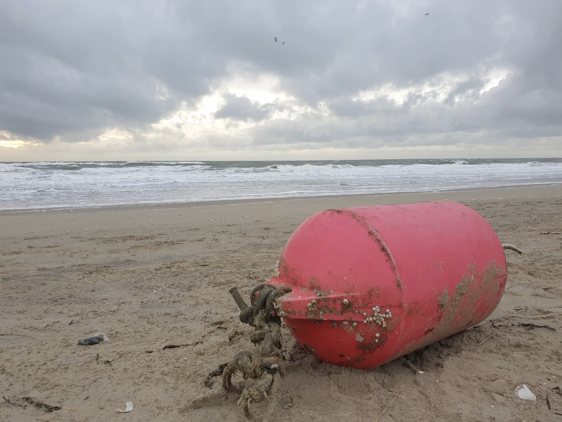 Judith en Arjen, twee vrijwilligers achter onze stichting, lopen veelvuldig te struinen langs de vloedlijn waar altijd wel wat bijzonders te vinden is. Zo ook onlangs toen ze een grote rode boei tegen kwamen op het strand van de Maasvlakte. Loodzwaar, door een kleine lek in de afsluiting waren er zand en zeewater ingesijpeld. De boei rolt al enige tijd in de branding en kan geen “afnemer” vinden vanwege zijn gewicht. Maar fungeert hierdoor als markant punt waar iedere wandelaar naar toegezogen wordt. De attractie is dan toch om even te proberen hem te verplaatsen.