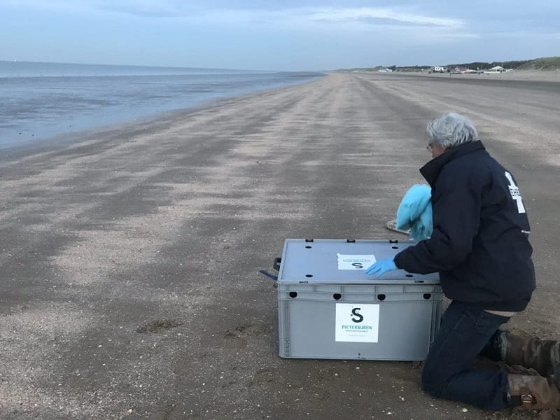 Het sterk verzwakte dier was gisterenochtend al gemeld door oplettende strandgangers, maar helaas weer terug gegaan naar zee.