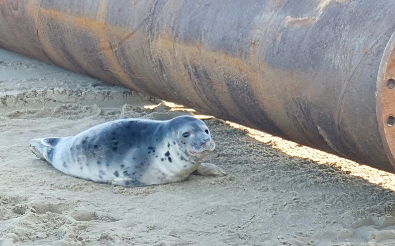 Een kruipspoor vanuit zee leidde naar een plekje tegen de stalen buis en in de schaduw lag, een beetje verstopt, inderdaad een jonge kegelrob.