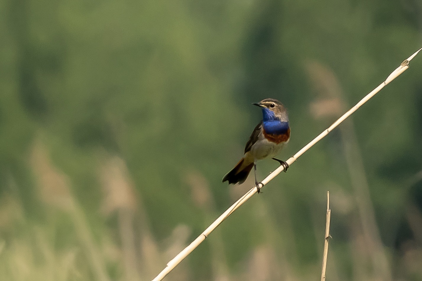 De Blauwborst is hier een fraai voorbeeld van. Deze zanger laat dat ook zien in de rietkraag van het groene strand van Voorne. Droomvogeltje om te waar te nemen: mooie zang, fraaie vogel en zittend in de top van het riet. Met de kop in de volle zon. Ideaal om zo vast te leggen.