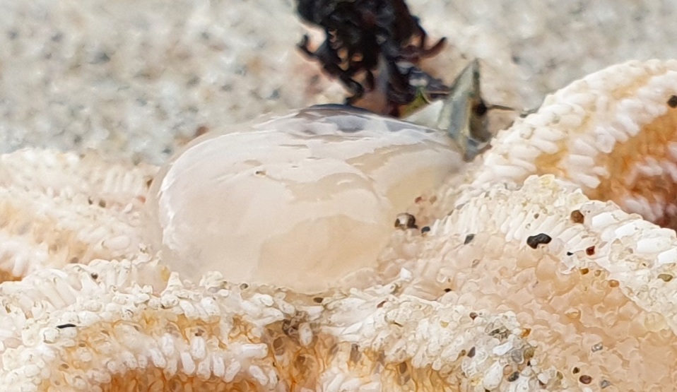 Hierboven zie je de maag van de zeester als een doorschijnende uitstulping.