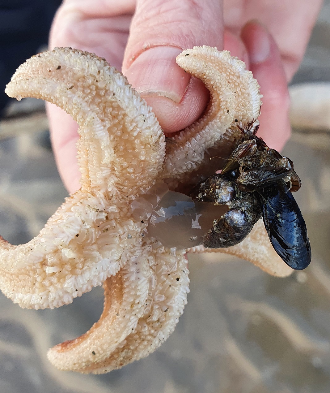 Op deze manier kun je een grote prooi al verteren tot een voor de zeester geschikt formaat.
