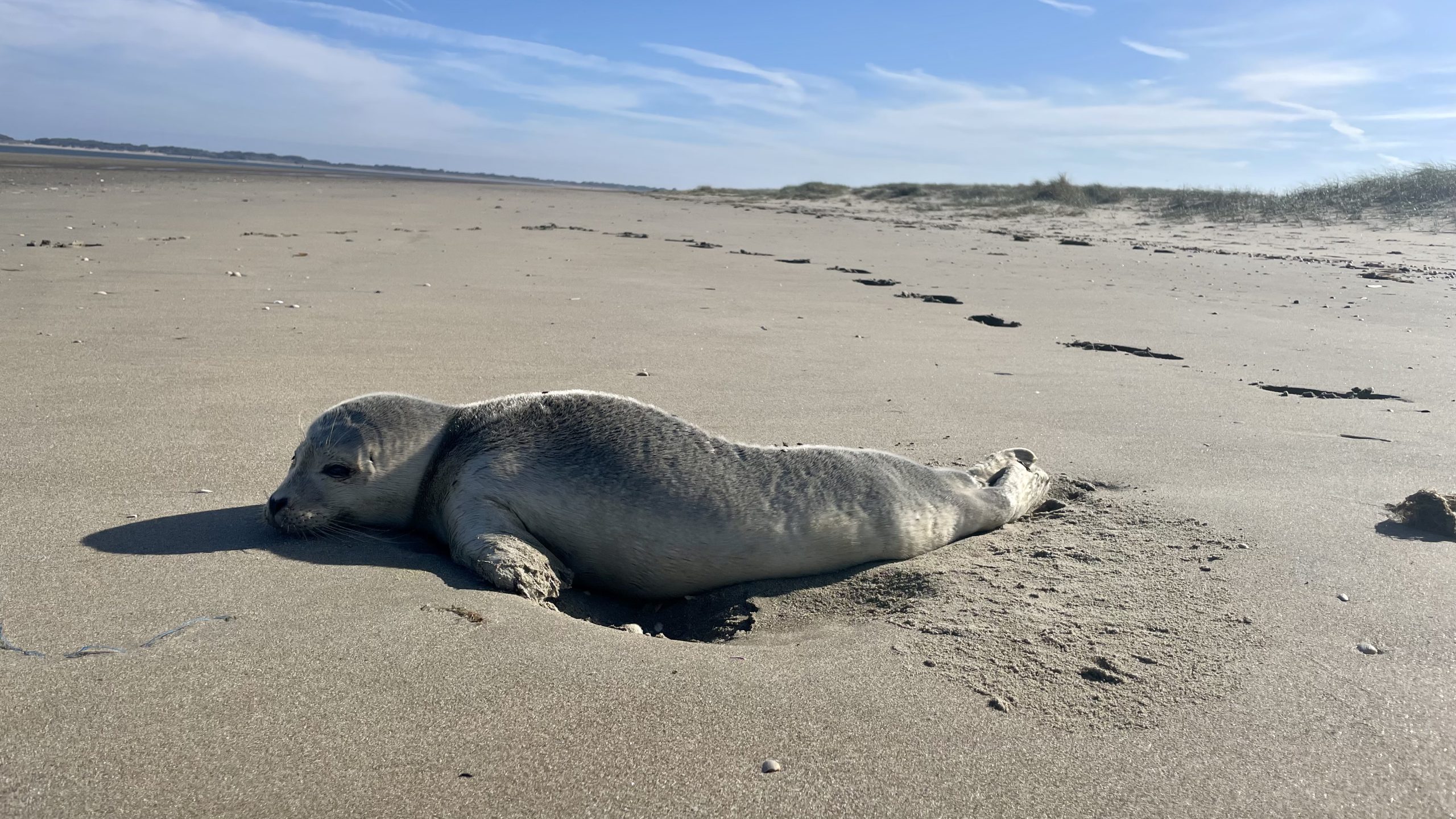 Dit zeehondje werd al vroeg op de dag aangetroffen op het strand en bij benadering deed het dier geen enkele poging zich te verplaatsen.