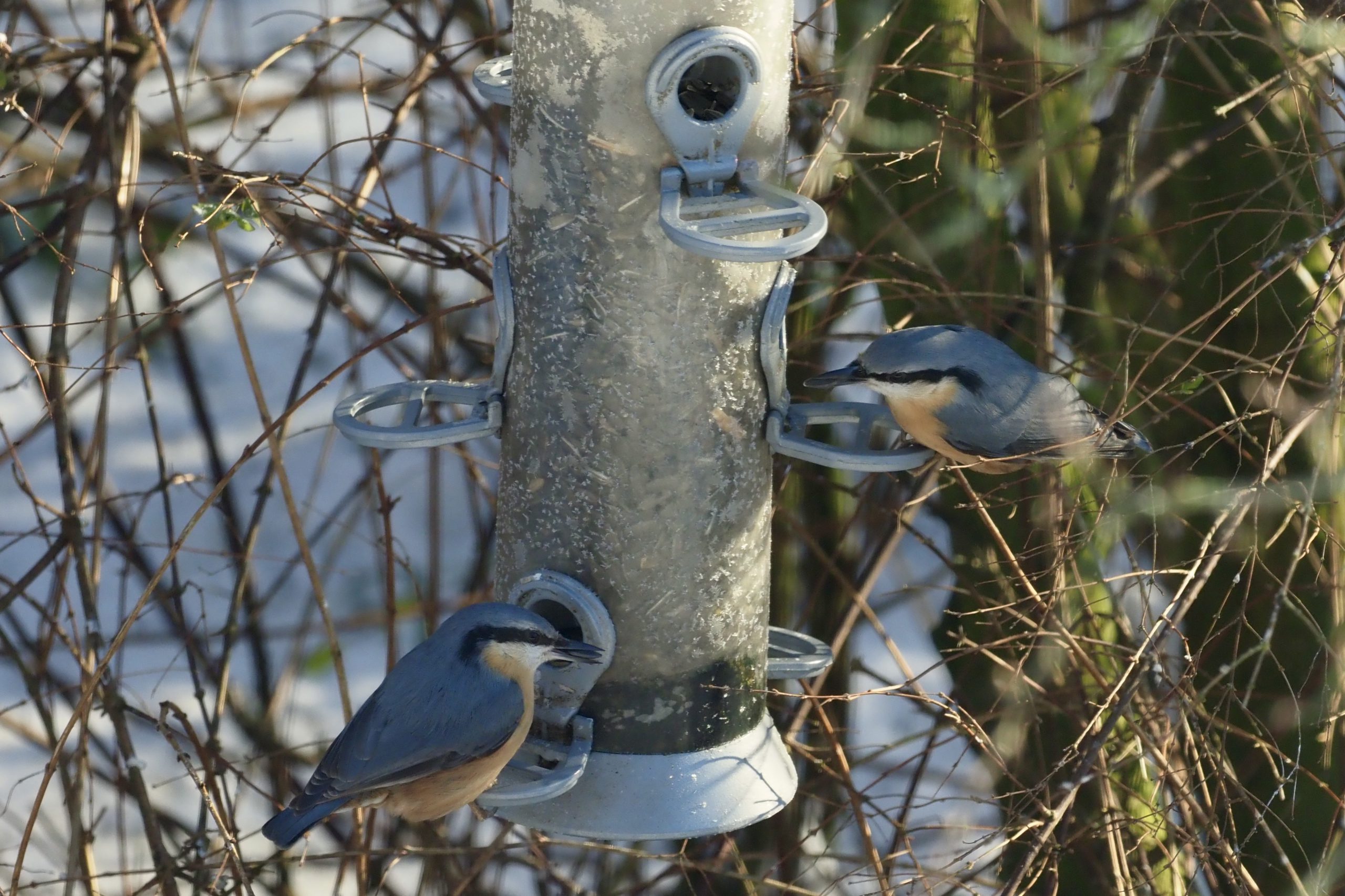 In de witte achtertuin waar dagelijks tientallen vogels zich tegoed doen aan het vogelvoer zaten deze twee boomklevers op de voedersilo met een zonnebloempit in de bek. Boomklevers zijn fraaie vogeltjes met een subtiel kleurpatroon in pasteltinten. Voedsel vinden ze in de schors van de boom die ze in een spiraal aftasten van onder naar boven en terug, dan met hun kop naar beneden. Dit mogelijk gemaakt door de lange en krachtige tenen. Niet te verwarren met de meer ingetogen gekleurde boomkruiper die alleen van onder naar boven kan klimmen en dan weer naar beneden moet vliegen. Je hebt altijd baas boven baas en mindere baas. Maar nu terug naar de boomklever: zeldzaam zijn ze niet, hooguit minder bekend. In de wintermaanden zijn ze bij gebrek aan insecten in de boomschors ook veelvuldig op voedertafels te vinden. Wat deze opname bijzonder maakt is dat er twee tegelijkertijd zitten met een pit in hun bek. Deze vogeltjes zijn van het “hit and run” type: zaadje pakken, meteen wegvliegen en elders veilig oppeuzelen. De gemiddelde verblijftijd op de voedersilo is dus heel kort, er dan twee gelijktijdig aan te treffen is een kleine kans.