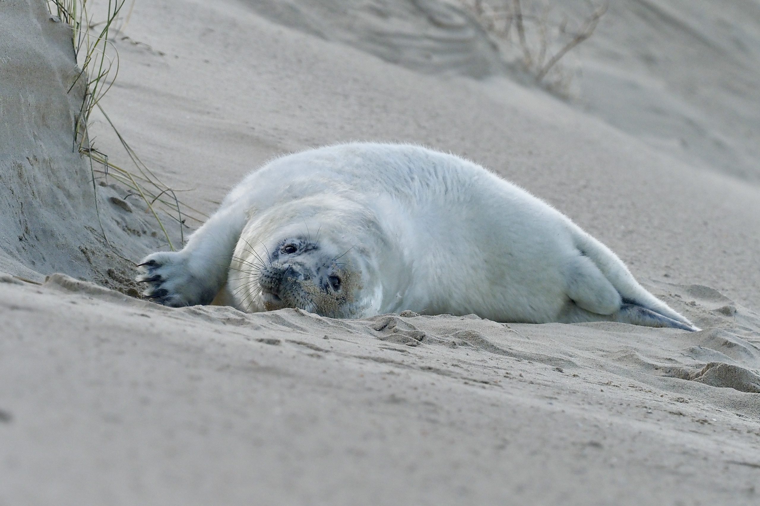 Om enige structuur in mijn fotoarchief aan te brengen heb ik deze pup maar gecodeerd als “Joep de Zeehond”. Joep de Zeehond lag al een kleine drie weken op deze plek, vermoedelijk daar ook geboren. Op moment van de opname zo’n beetje aan het eind van de zoogperiode en maximaal op gewicht. Het zou me niets verbazen als dit rond 40 kilo was. Aan de kop te zien was het verharen op gang gekomen. De witte vacht gaat plaats maken voor een gladdere donkergrijze. Hier kan beter mee gezwommen worden (en vis gevangen). Let op de nagels aan de poten, scherp en lang. De tanden mogen er ook zijn, afstand houden dus. De beesten zijn goed in staat om van zich af te bijten.